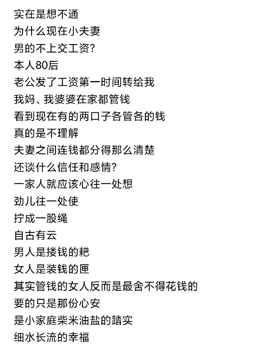 以前女的适合管钱,现在不一样了,女生都是有多少用多少,都是不能委屈自己的小仙女[笑哭] 我媳妇一月七八千,钱我是一分没见到,基本月月光。家里开支是我出,剩下的真不敢给她,没任何存钱意识,有多少花多少。 两口子过日子,根据自己的特点怎么舒服怎么来。没必要非打听别人家如何如何,然后非要学人家那一套。置于谁管钱,谁做家务,大事谁做主。那就要看你擅长做什么,理财好你就管钱,做饭好你就做饭。扬长避短,就是和谐的生活方式。女人经济要独 女孩挣钱意义 对女人要挣钱 老婆当家管钱 女生一个月花销 女生经济自由 女生生活费
