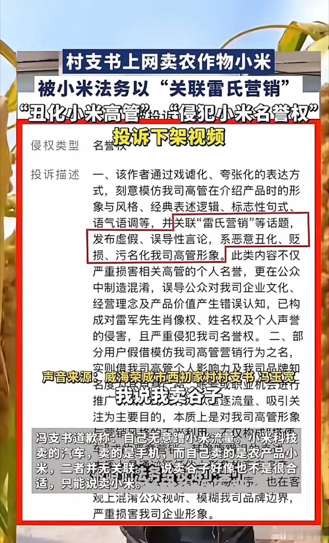 小米回应村支书卖小米被投诉看了一下视频,我觉得村支书被小米投诉一点都不冤。你说你卖小米就老老实实卖小米,你老是蹭小米的热度干嘛,打着小米发布会的词条,蹭着小米雷军的热度词条,然后被人投诉了又开始卖惨。人家投诉的理由是侵犯名誉权,而不是他所谓的什么商标权。那么多直播卖小米的,不投诉别人为什么就投诉你,你心里没点数吗?热点观点