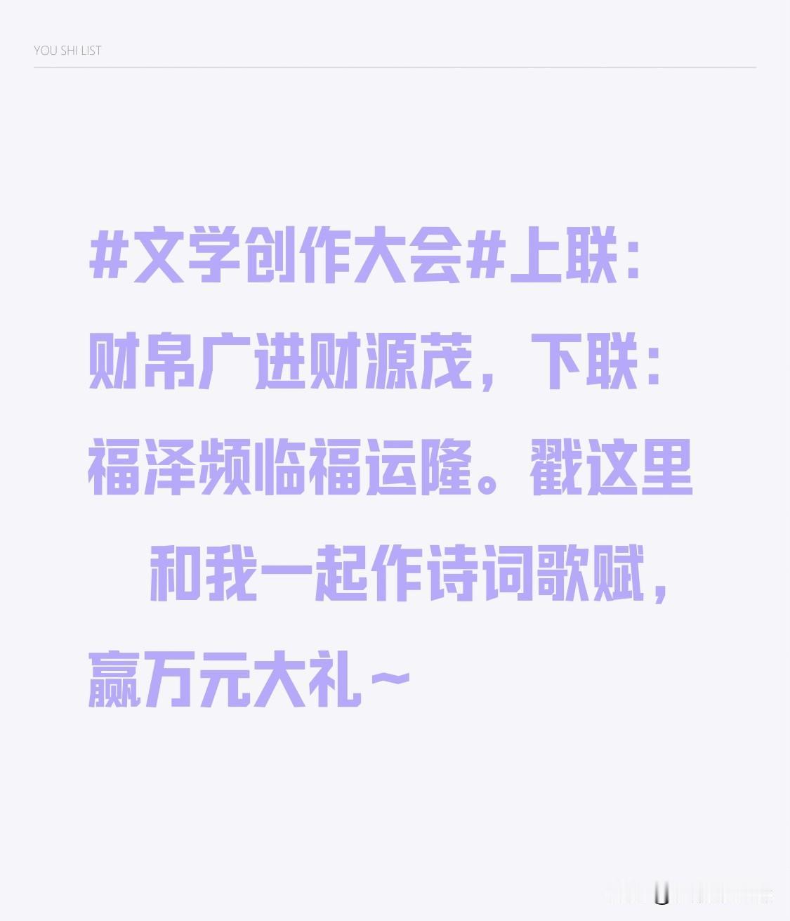 文学创作大会 这上联“财帛广进财源茂”,一听就是满满的富贵气,寓意着财富像潮水般涌来,生意那是红红火火。下联“福泽频临福运隆”也相当妙,福气接二连三地降临,好运就像那芝麻开花节节高。 我觉得文学创作大会搞这种对联创作活动超棒!既能考验大家的文学功底,又能激发创作灵感。想象一下,要是自己创作出一副绝妙的对联,还能赢取万元大礼,那简直太有成就感了。我已经准备大展身手,和各路高手一决高下,说不定幸运女神就眷顾我啦!