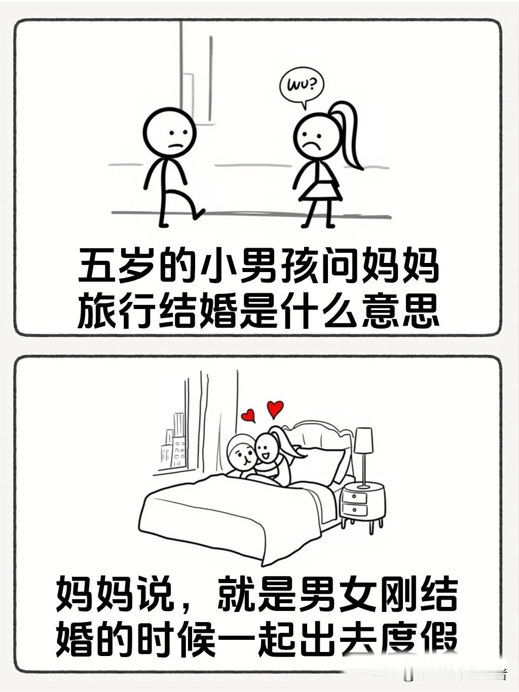 趣味漫画:“五岁小男孩问妈妈,旅行结婚是什么意思妈妈说,就是男女刚结婚的时候一起出去度假男孩又问:那你和爸爸带我去了么?妈妈宠爱地回答…”