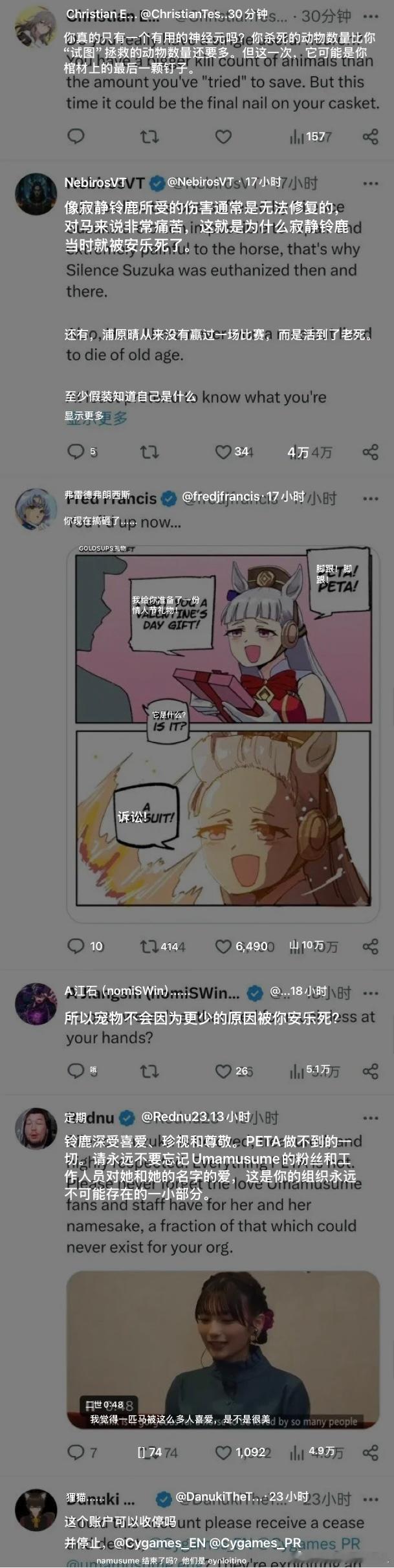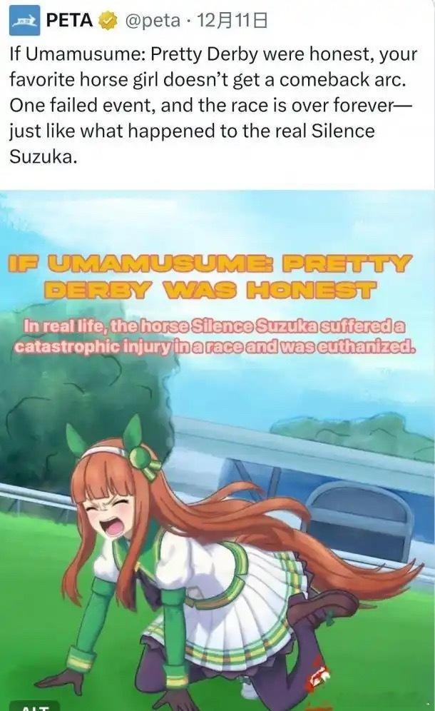 动保组织大战二次元,因动保组织拿赛马娘的无声铃鹿图来宣传,其角色原型在一次比赛中受伤骨折且难以治愈,最后被安乐死。