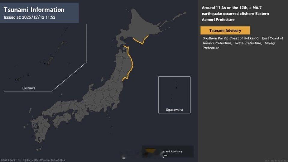 日本地震 12月12日 02:44 UTC,日本东北海岸附近发生6.7级地震,震中位于北纬 40.900°,东经 143.000°,深度 16 公里,震中位于久慈东北 130 公里处。这似乎是 12 月 8 日青森县附近发生的 7.6 级主震之后的一次显著余震。日本气象厅发布海啸警报后迅速解除,此次事件未造成巨浪或直接损失。北海道和三陆沿海地区仍处于罕见的“后续地震预警”之下,预警持续至 12 月 16 日,覆盖从北海道到千叶的 182 个市町村,将每周发生 8 级以上地震的风险提高到约 1%(比正常情况高出十倍)。12 月 8 日的地震造成至少 52 人受伤,引发高达 70 厘米的海啸,导致约 9 万居民撤离,并造成轻微损失,包括新千岁机场的天花板坍塌和长崎山神罗神社等历史遗址的建筑物倒塌。当局敦促民众在余震不断的情况下继续保持警惕并做好疏散准备。海外新鲜事