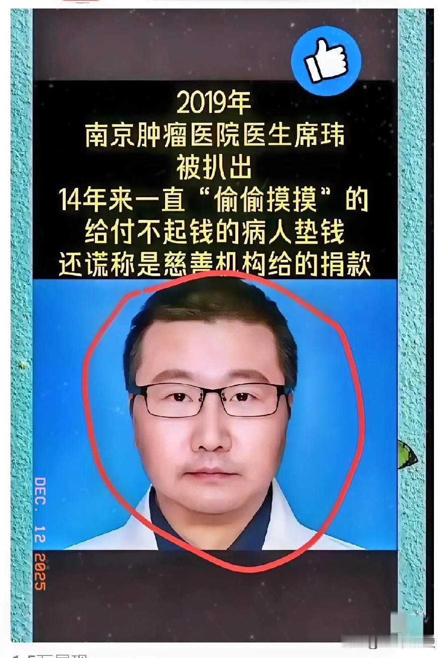 这年头查账,总想着揪出几个蛀虫。 结果南京一家医院,竟查出个‘好人’——席玮医生。 14年间为287位癌症患者垫付的医药费,超过50万元。 他不想让病人“难堪”,谎称是慈善机构捐款给患者的医药费。 他自己住在老房子里,生活简朴,妻子的睡衣有补丁。 省吃俭用下,夫妻俩把钱都给了陌生的患者。 一个垫付医药费50万的席玮医生,忘记了自己。 一个拿着账本,为287位患者记录每一笔垫付金额和患者情况,却没有记录自己名字的席玮医生,用行动守住善良,不让病人心里更沉重。 坐着六楼楼梯回家,每天与病魔斗争,坚守了14年,值得被更多人铭记。 大家对于这事有什么看法呢?