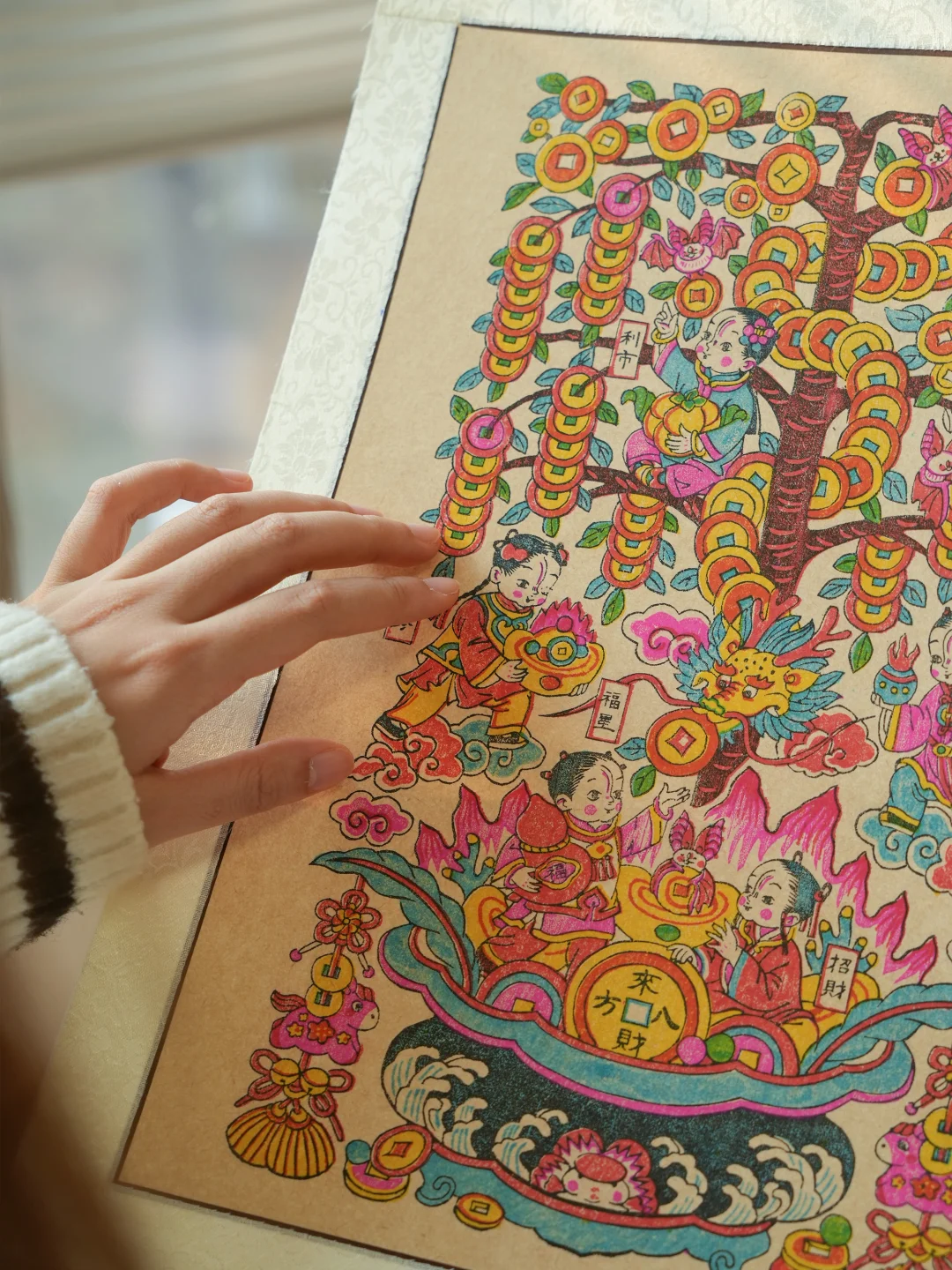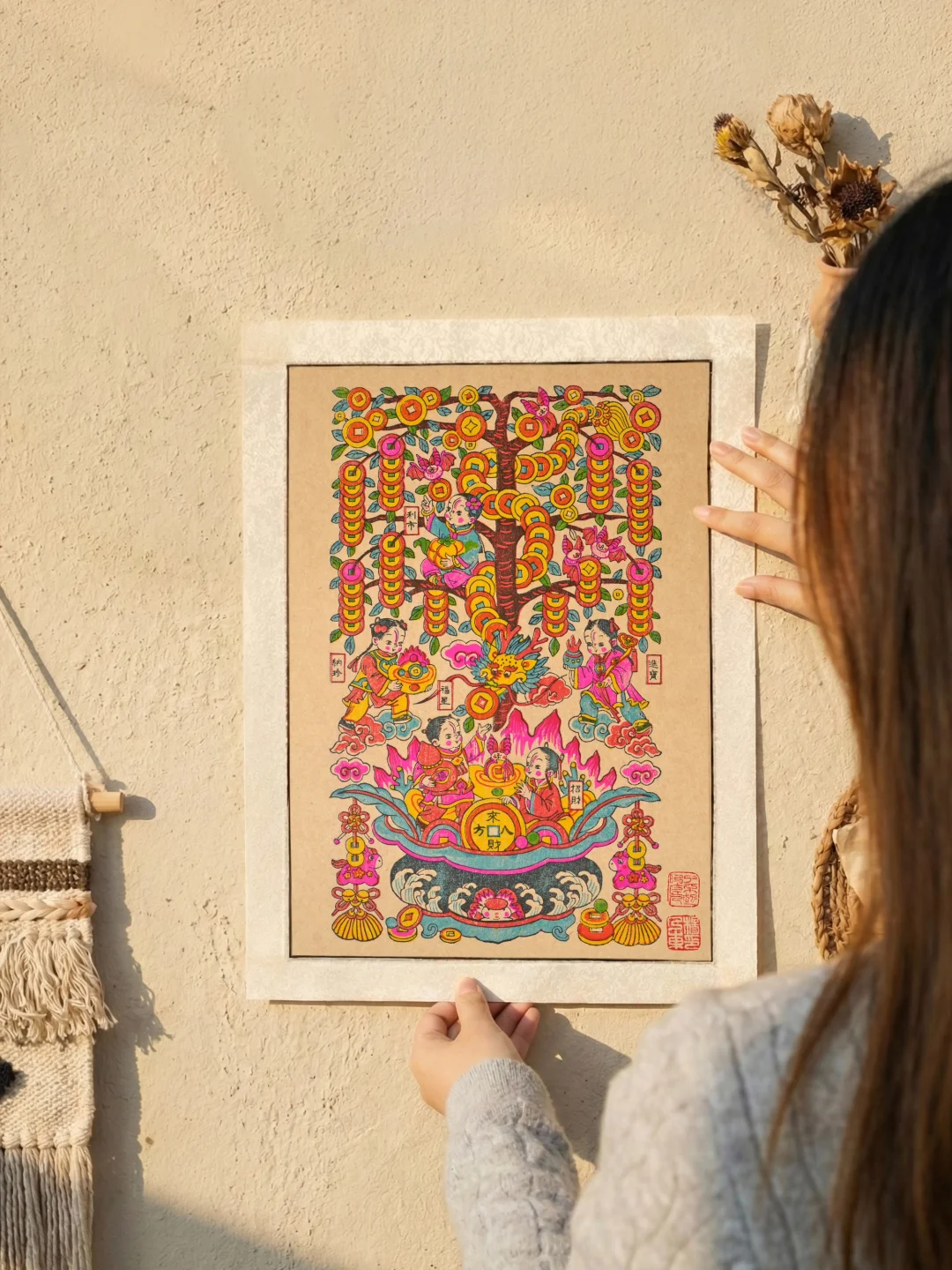 明天就要上线我们的首款年画产品 心情还是有点小激动的~ 在年画这件事上我们花了许多功夫 杨家埠、武强、朱仙镇、滩头... 走访了全国7个年画产地 见识到了各地的年画风格 也以5w张的年画成绩占领年画榜首 这一次我们选择了最初的杨家埠年画 以杨家埠摇钱树为基础 通过当代设计 × 非遗手艺的结合 让老手艺被重新看见、被重新喜爱 产品上做了画面、颜色、装裱的改进 新年之际带回家装饰 特别有仪式感 希望大家2026好运自来✨ 「五福摇钱树」上线倒计时1天!