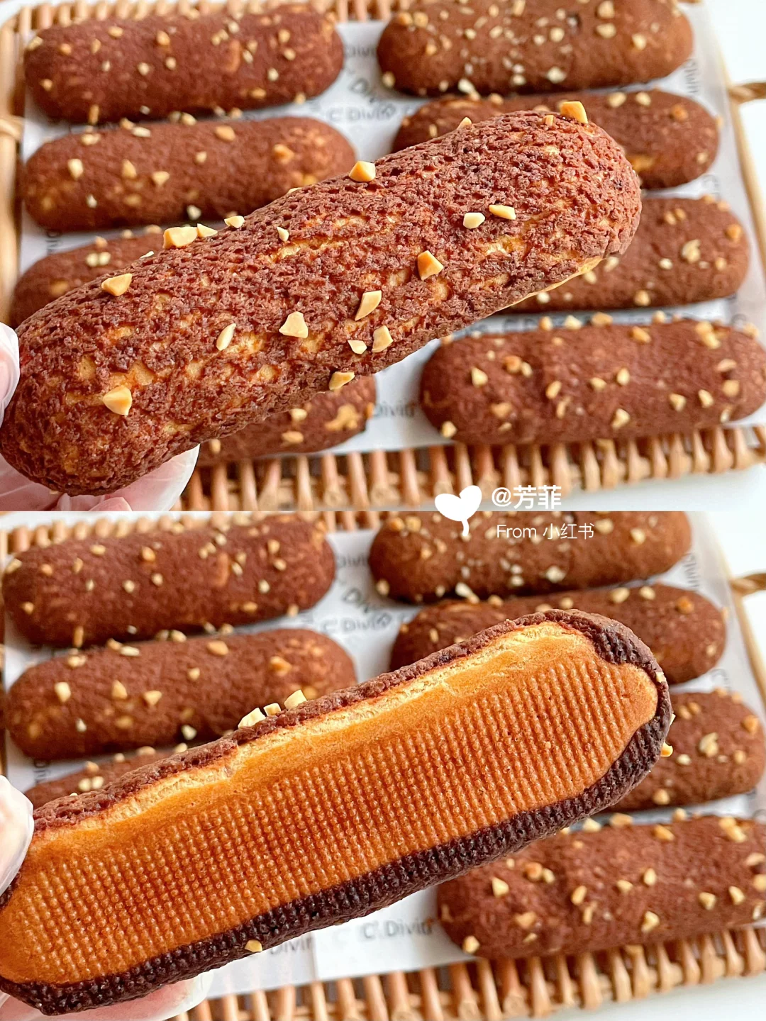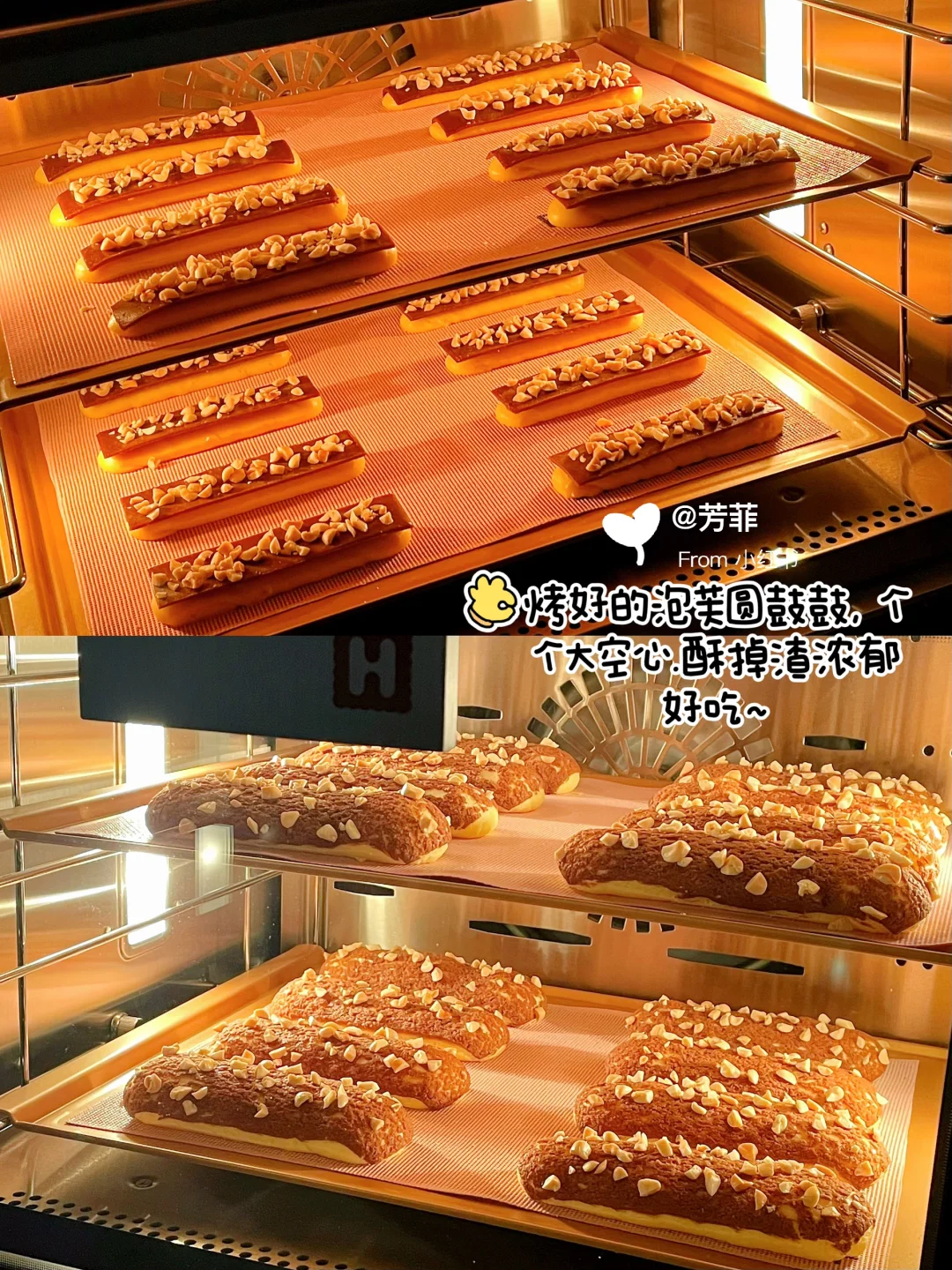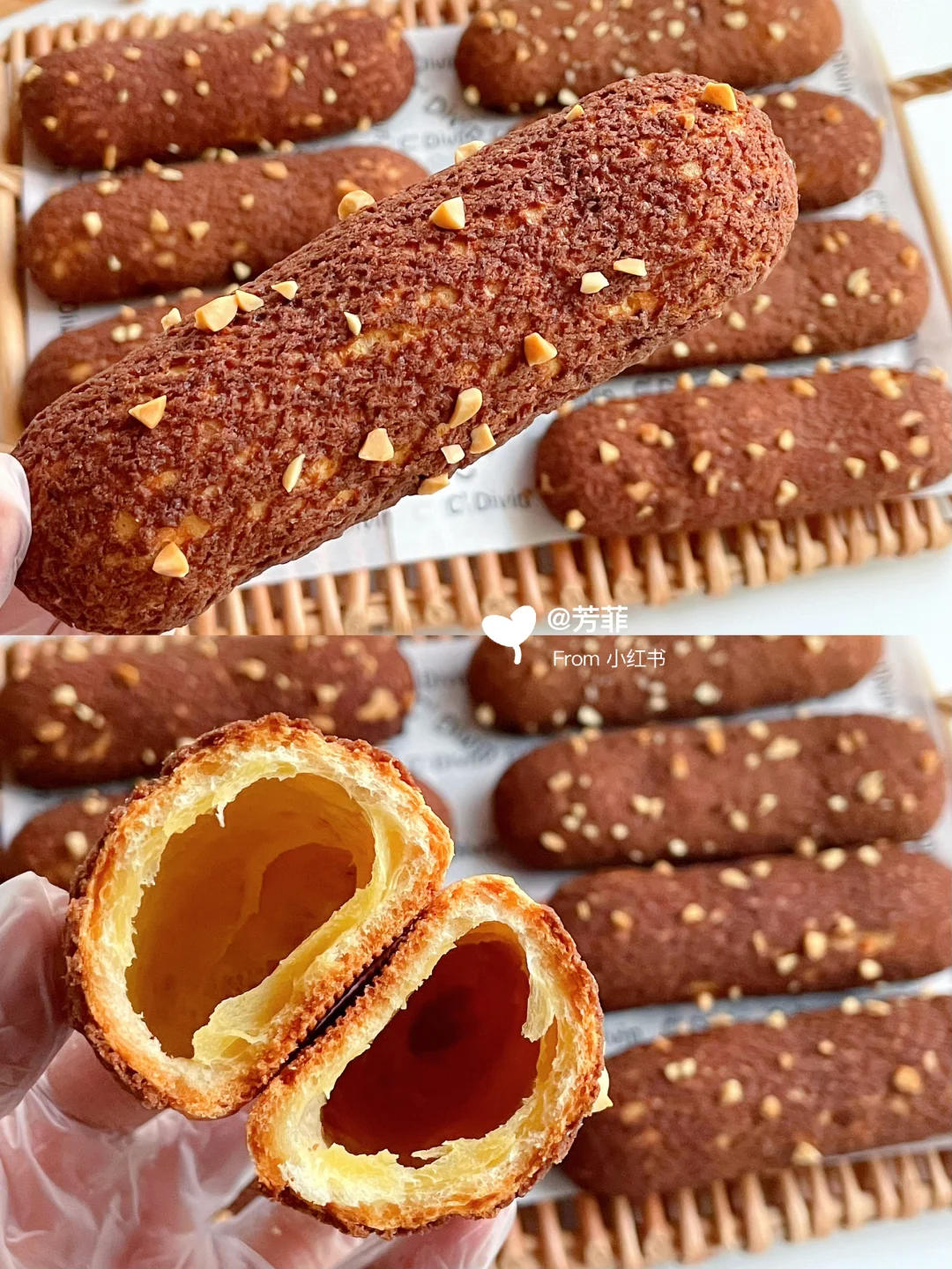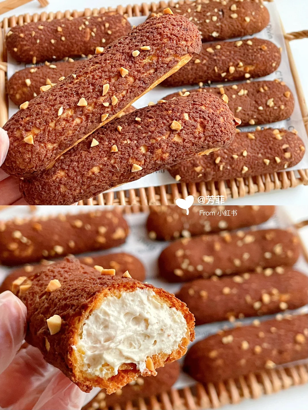 🌈巨巨好吃的酥皮法棍泡芙,香酥掉渣每个都大空心;👯红糖可可酥皮,加上榛子酱奶油浓郁不甜腻,一口下去好吃到飞起!不仅孩子喜欢,大人也超爱.喜欢的快去试试吧💃🏻💃🏻 ♨️泡芙面糊可以挤长条/圆形均可,掌握好面糊状态和烘烤温度,基本都能一次成功.👉🏻跟着详细教程做起来~ —————— 🔸食材:(配方量可做两盘/约16~20个) ⊳酥皮:红糖40g | 黄油55g | 低粉55g | 可可粉0.5~1g) ⊳泡芙:牛奶100g | 清水100g | 黄油90g | 糖8g | 盐4g | 低筋粉80g | 高筋粉30g | 全蛋液170~195克 ⊳奶油夹馅量随意 🔸做法: 1️⃣先做酥皮.黄油软化加红糖压拌匀,加低粉、可可粉切拌均匀.放两张油纸间,擀成薄片2㎜厚长约27宽约24㎝,冷冻定型切成12✖️3的小长条,继续冷冻备用 2️⃣再来做泡芙.准备好食材,低粉高粉提前混合过筛.奶锅中加入黄油、牛奶、水、糖、盐,中小火加热沸腾关火迅速加入过筛的面粉,翻拌匀再开最小火翻炒一分钟锅底有薄膜的状态,让面糊充分糊化 3️⃣倒入打蛋盆摊开散散热,大概五六十度温热时分次加入室温全蛋液,用打蛋器或刮刀搅拌匀.每加一次都需搅拌混合吸收再加下次,面糊变稠后少量多次添加蛋液调整面糊状态 4️⃣混合后的面糊细腻有光泽,刮刀挑起面糊缓缓垂落后,呈顺滑倒三角状.提前预热烤箱,面糊装入裱花袋,均匀间隔挤在烤垫上,长度约12㎝.收尾处小尖角用手指沾点水轻轻抹匀,再表面盖上酥皮撒点花生碎 5️⃣烤盘放入预热好的烤箱,单盘烤平炉180℃烘烤35分钟左右,焖五分钟出炉。双盘用风炉160℃烘烤40分钟左右,中途不要开烤箱门.⚠️新手先做单盘烤拿捏烤箱温度再考虑双盘,具体烘烤温度和时间需按自家烤箱温差灵活调节 🌿🌿烤好的泡芙出炉晾凉,奶油➕砂糖➕榛子酱打发,泡芙侧面戳洞挤入奶油即可.加了奶油的泡芙适合现做现吃,不易久存。酥掉渣超浓郁巨巨好吃,快试试吧