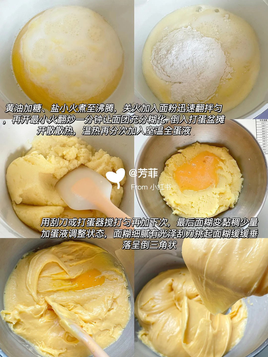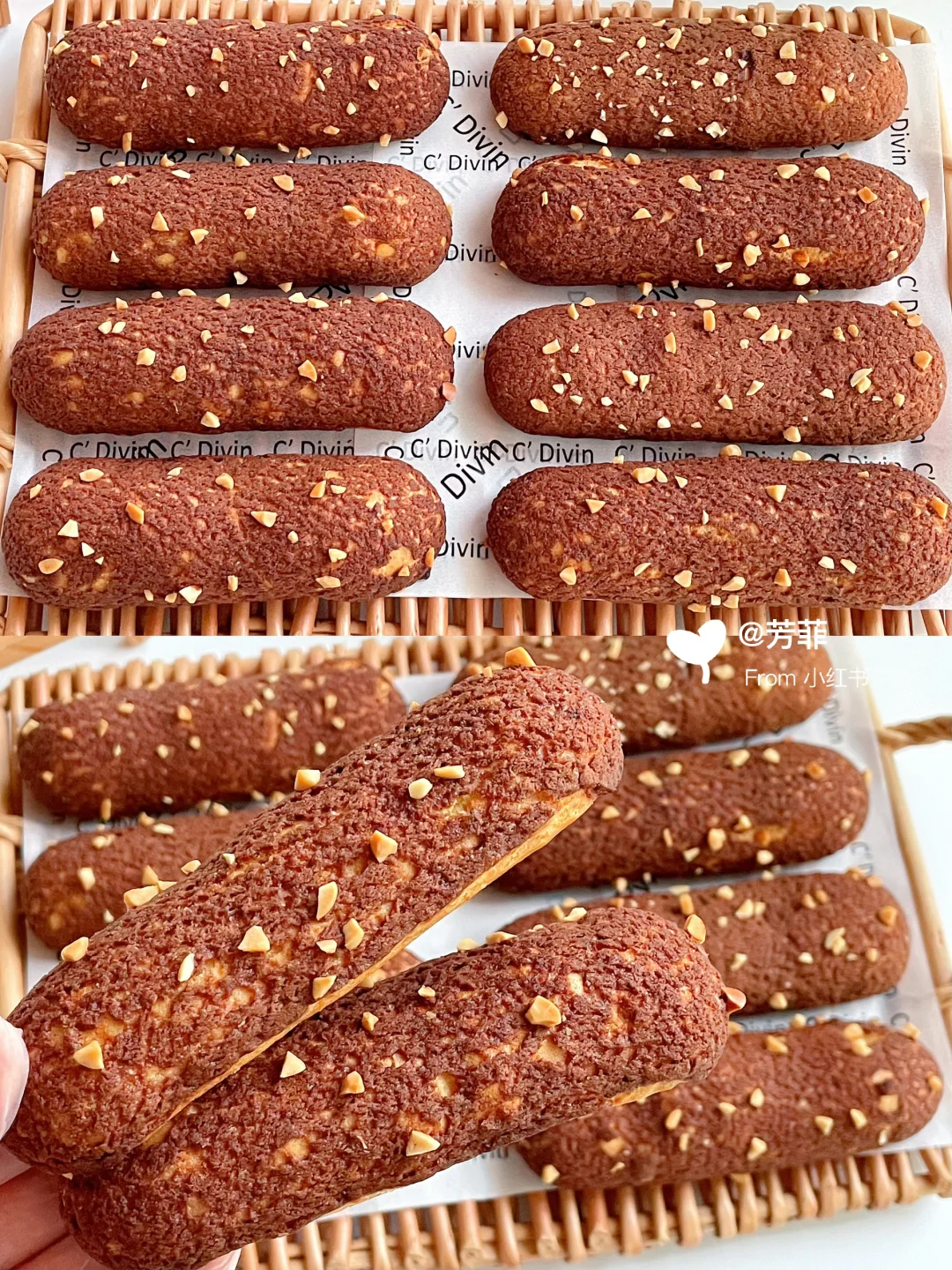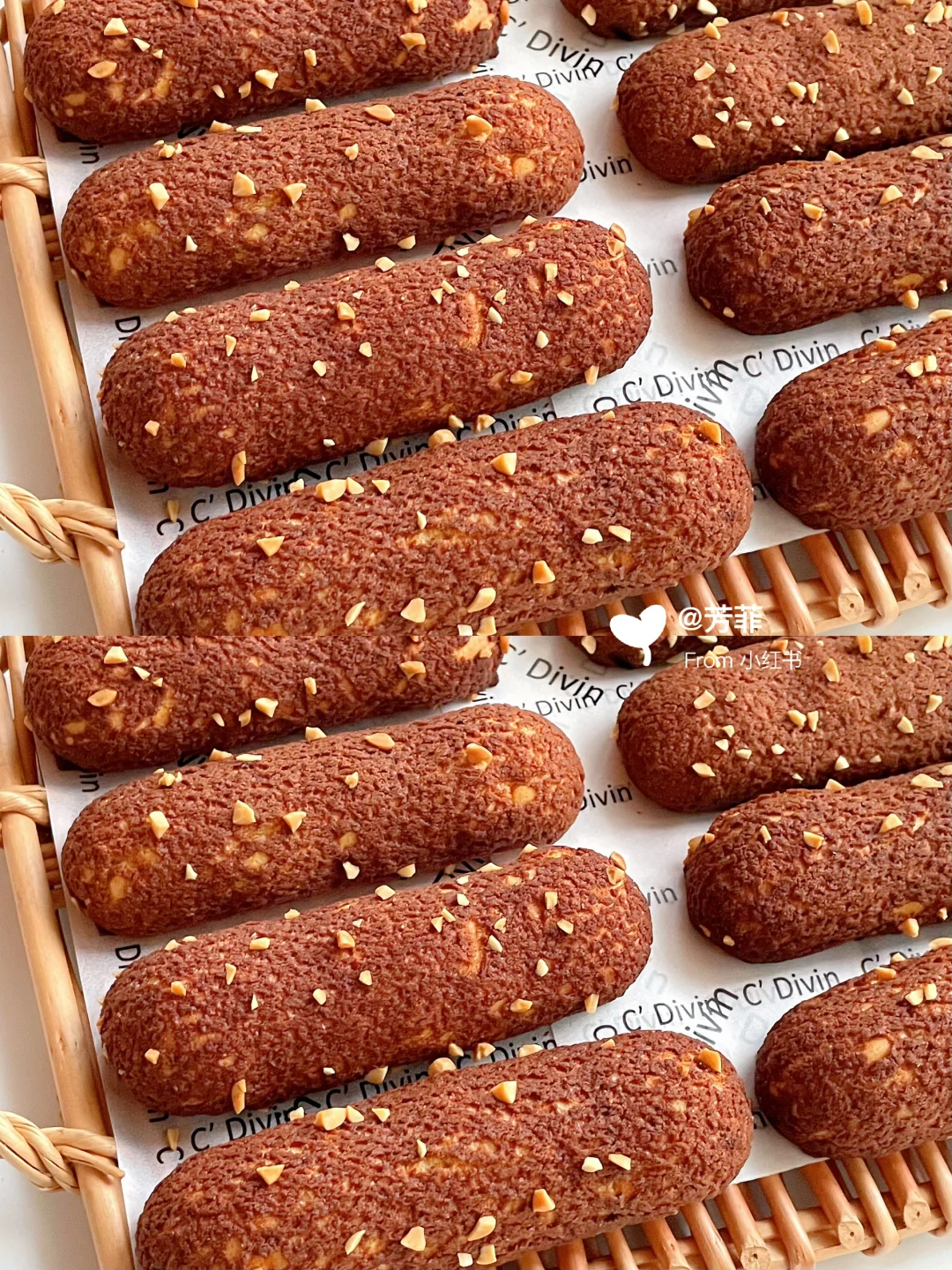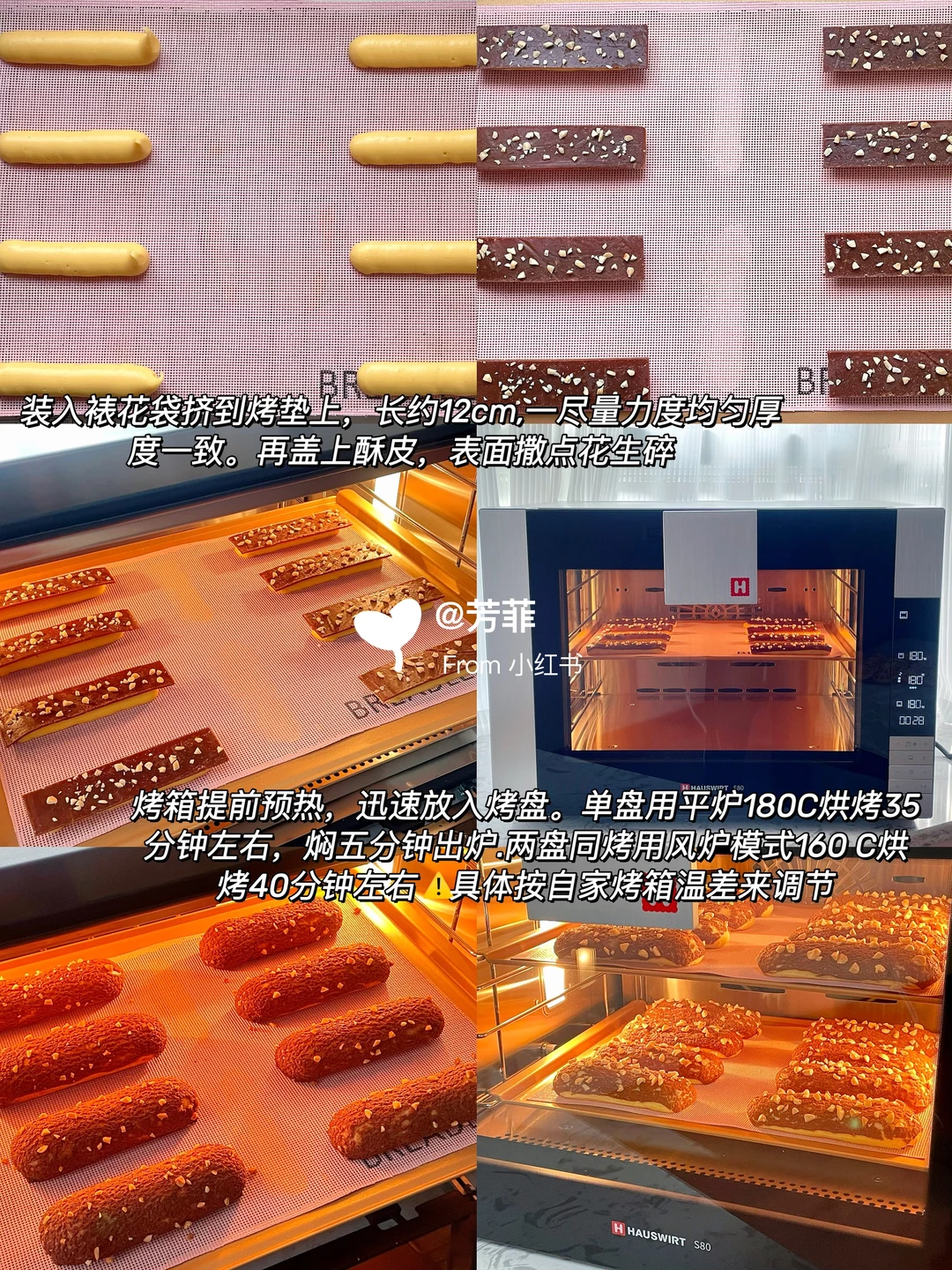 🌈巨巨好吃的酥皮法棍泡芙,香酥掉渣每个都大空心;👯红糖可可酥皮,加上榛子酱奶油浓郁不甜腻,一口下去好吃到飞起!不仅孩子喜欢,大人也超爱.喜欢的快去试试吧💃🏻💃🏻 ♨️泡芙面糊可以挤长条/圆形均可,掌握好面糊状态和烘烤温度,基本都能一次成功.👉🏻跟着详细教程做起来~ —————— 🔸食材:(配方量可做两盘/约16~20个) ⊳酥皮:红糖40g | 黄油55g | 低粉55g | 可可粉0.5~1g) ⊳泡芙:牛奶100g | 清水100g | 黄油90g | 糖8g | 盐4g | 低筋粉80g | 高筋粉30g | 全蛋液170~195克 ⊳奶油夹馅量随意 🔸做法: 1️⃣先做酥皮.黄油软化加红糖压拌匀,加低粉、可可粉切拌均匀.放两张油纸间,擀成薄片2㎜厚长约27宽约24㎝,冷冻定型切成12✖️3的小长条,继续冷冻备用 2️⃣再来做泡芙.准备好食材,低粉高粉提前混合过筛.奶锅中加入黄油、牛奶、水、糖、盐,中小火加热沸腾关火迅速加入过筛的面粉,翻拌匀再开最小火翻炒一分钟锅底有薄膜的状态,让面糊充分糊化 3️⃣倒入打蛋盆摊开散散热,大概五六十度温热时分次加入室温全蛋液,用打蛋器或刮刀搅拌匀.每加一次都需搅拌混合吸收再加下次,面糊变稠后少量多次添加蛋液调整面糊状态 4️⃣混合后的面糊细腻有光泽,刮刀挑起面糊缓缓垂落后,呈顺滑倒三角状.提前预热烤箱,面糊装入裱花袋,均匀间隔挤在烤垫上,长度约12㎝.收尾处小尖角用手指沾点水轻轻抹匀,再表面盖上酥皮撒点花生碎 5️⃣烤盘放入预热好的烤箱,单盘烤平炉180℃烘烤35分钟左右,焖五分钟出炉。双盘用风炉160℃烘烤40分钟左右,中途不要开烤箱门.⚠️新手先做单盘烤拿捏烤箱温度再考虑双盘,具体烘烤温度和时间需按自家烤箱温差灵活调节 🌿🌿烤好的泡芙出炉晾凉,奶油➕砂糖➕榛子酱打发,泡芙侧面戳洞挤入奶油即可.加了奶油的泡芙适合现做现吃,不易久存。酥掉渣超浓郁巨巨好吃,快试试吧