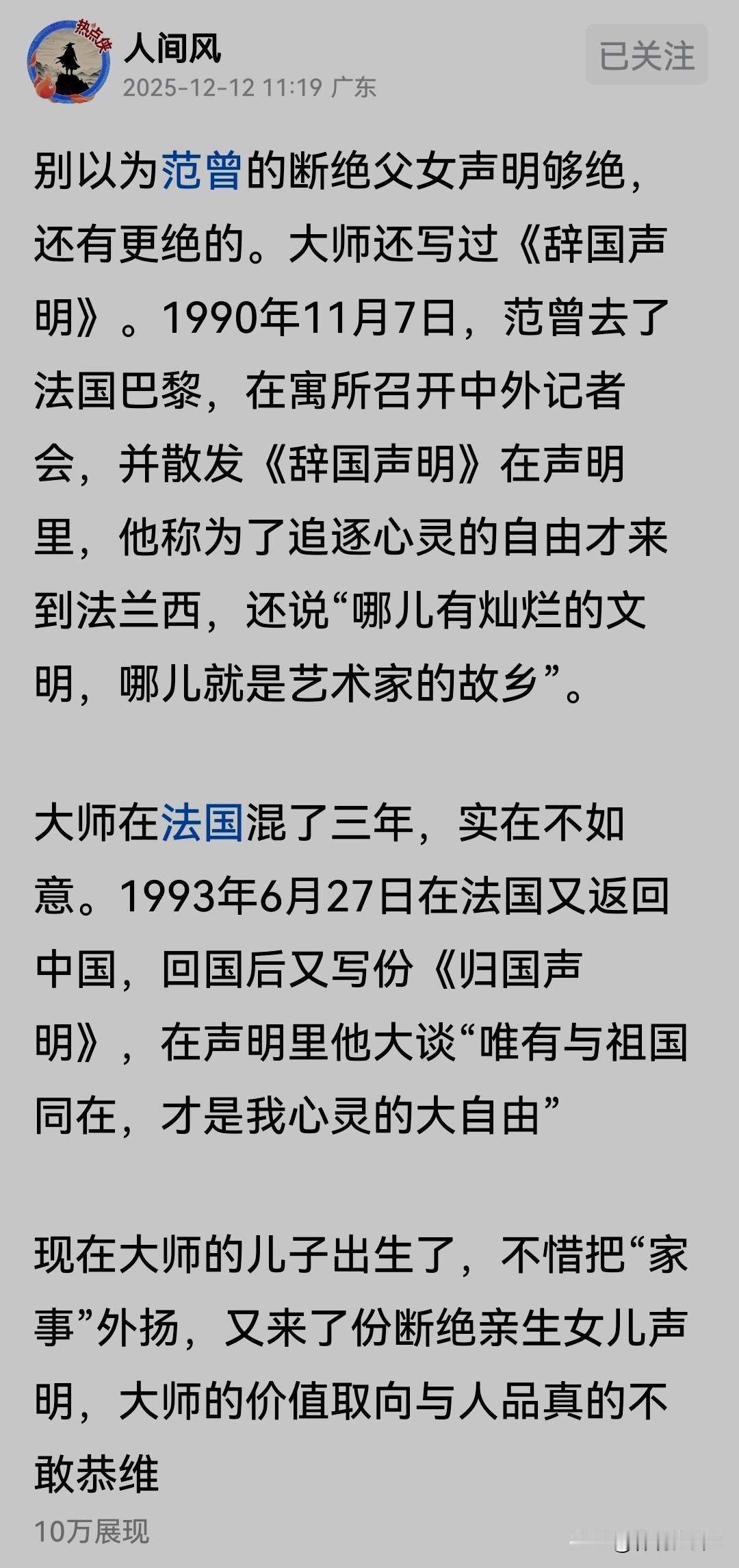 想不到范曾大师还有这一段历史?上世纪九十年代末期,大师为了追求自由和艺术,他离开祖国去了法国巴黎。1990年11月7日,范曾在法国巴黎的寓所召开中外记者会,记者会现场散发了《辞国声明》,在声明中范曾称,他为了追逐心灵的自由才来到法兰西,说的话语特别有诗意:“哪儿有灿烂的文明,哪儿就是艺术家的故乡”。 然而,范曾大师在法国混了三年,实在混不下去了,他不得不返回祖国。走的时候很有底气,回来的时候面子怎么处理?1993年6月27日回国后,范曾又写了一份《归国声明》,在归国声明中范曾同样很有底气,他大谈:唯有与祖国同在,才是我心灵的大自由。 现如今,87岁的著名书画家范曾大师有了独生子,12月11日,他公开声明与女儿、继子及其家属断绝关系,不再保持任何形式的往来。能发出这样的声明,完全符合范曾大师的性格和脾气。 范曾大师和他的继子范仲达断绝关系,这也符合情理,因为,他有了自己的亲儿子,当然不愿意把自己十几亿资产分给外人。但是,血浓于水,不相信范曾能与他的女儿范晓蕙彻底断绝关系。 从1990年11月7日范曾大师在法国巴黎发表《辞国声明》,到1993年6月27日范曾大师回国发布的《归国声明》,足以证明范曾大师的人品取向:哪里有利益,他就到哪里,不惜把说出去的话收回去。所以,如今范曾大师又声明与女儿和继子断绝关系,谁能保证过几年,他单独与亲生女儿再次恢复了父女关系,唯独把继子抛弃。 不过,如果真的仅把继子范仲达一个人抛弃,范仲达有苦只能咽肚子里,谁让他把徐萌介绍到继父那里去?当时他可能没有想到,无意中他牵线做了红娘,成全了继父范曾和徐萌这对夫妻,最终造成了自己被抛弃的结局。