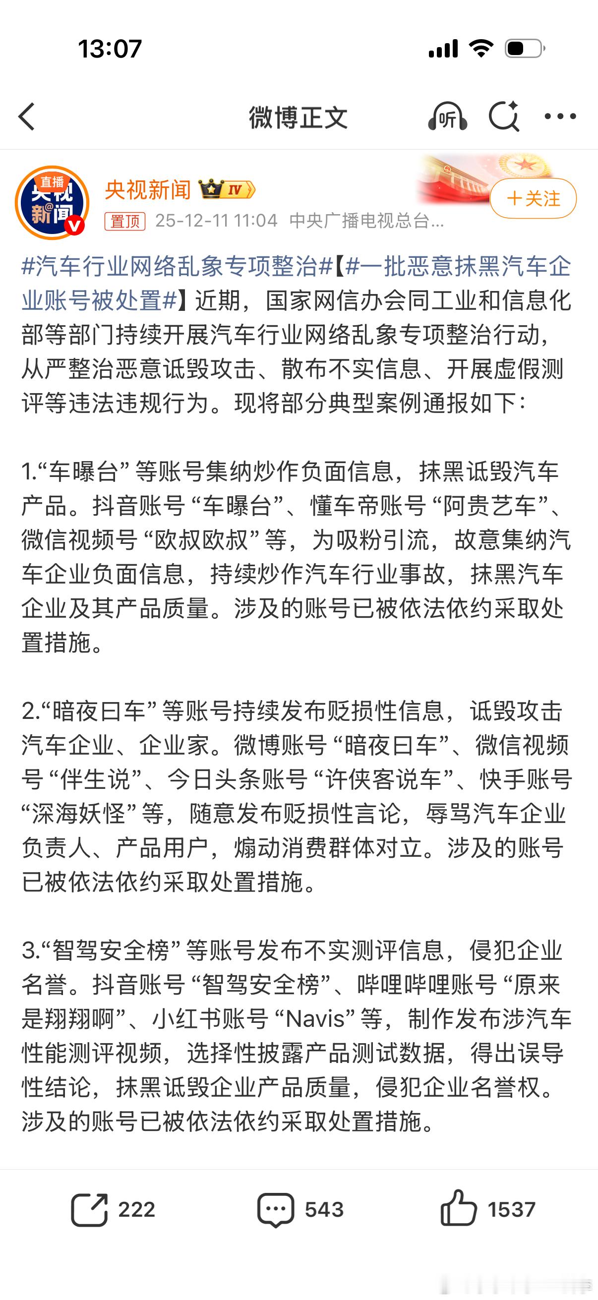 一批恶意抹黑汽车企业账号被处置你挑点车上的毛病讲不为过每一台汽车都有不足的地方奔驰 宝马 华为 小米 理想无一例外正常不足的地方你指出来没人会搞你恶意博取黑流量 捏造事实 搬弄是非目的不纯的这种行为严重了可是要吃牢饭的