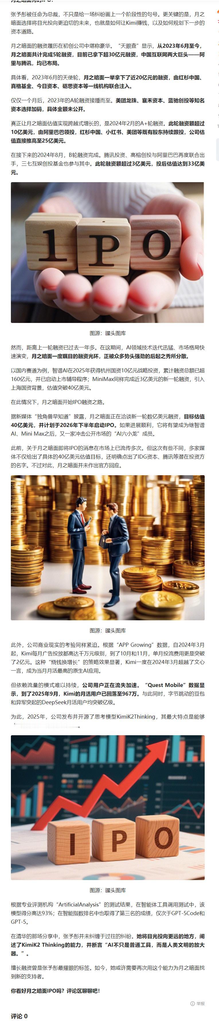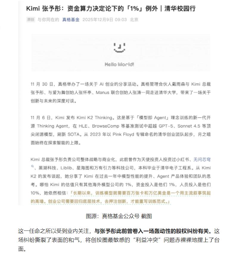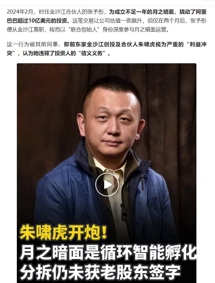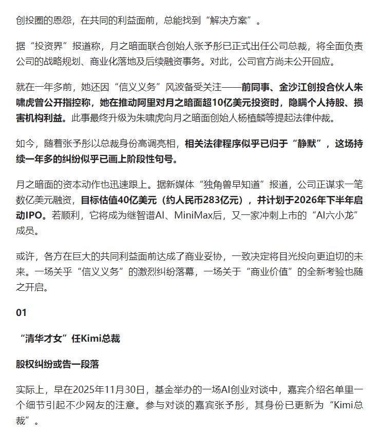 月之暗面宣布张予彤出任总裁,此前她因利益冲突遭朱啸虎仲裁。公司融资履历豪华,现瞄准 2026 年 IPO,估值目标 40 亿美元,面临 AI 行业激烈竞争与商业化考验。 原文来自:野马财经《被朱啸虎 “手撕” 后,清华才女升任Kimi总裁,240亿月之暗面拟IPO》