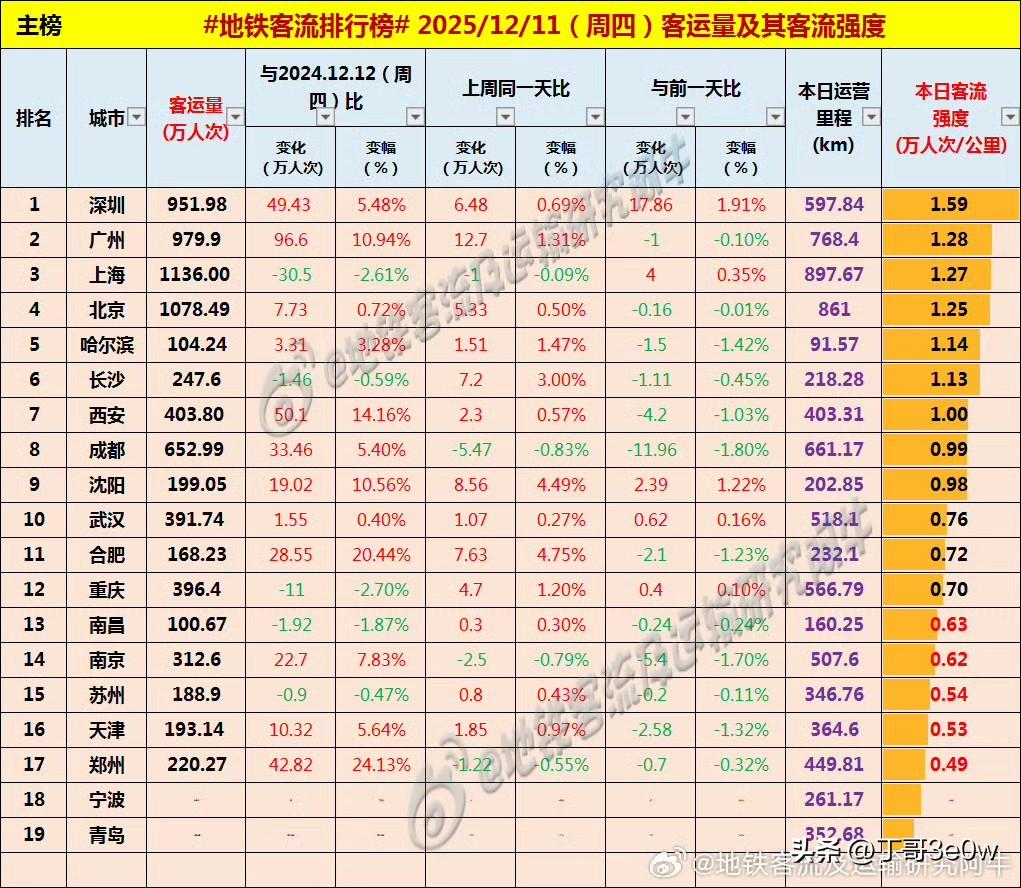 沈阳周四地铁客流量199万人次多,差一点超过了200万[呲牙][呲牙][呲牙] 爆料 身边事 排行榜 周四 沈阳地铁 2025年12月11日 星期④ 全国重点城市轨道交通客流量排行榜: 上海:1136.00万上海b l 北京:1078.49万 广州:979.90万广州地铁 深圳:951.98万深圳地铁 成都:652.99万 西安:403.80万西安身边事 重庆:396.40万重庆身边事 武汉:391.74万 南京:312.60万南京地铁 长沙:247.60万 郑州:220.27万郑州爆料 沈阳:199.05万沈阳身边事 天津:193.14万天津身边事 苏州:188.90万 合肥:168.23万合肥地铁 青岛:100万+青岛地铁 宁波:100万+ 哈尔滨104.24万哈尔滨爆料 南昌:100.67万
