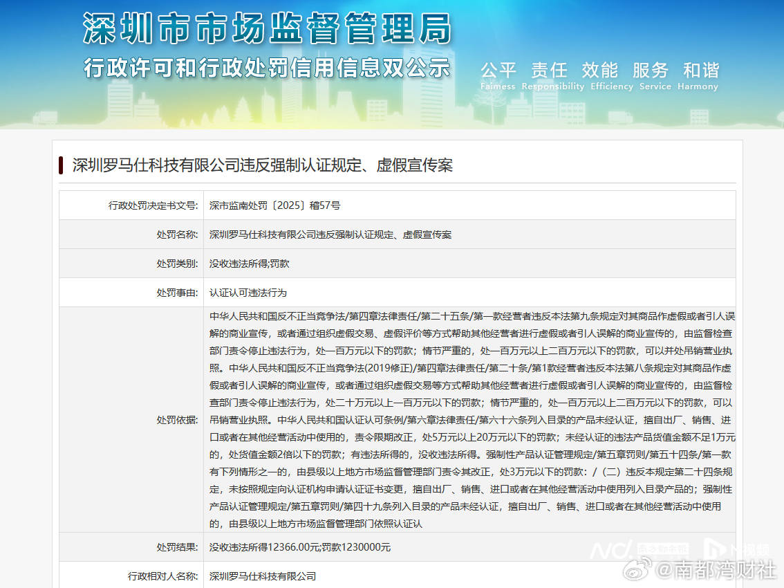 【违反强制认证规定以及涉嫌虚假宣传!#罗马仕被罚123万元#】#罗马仕违反强制认证规定# 深圳市市场监管局官网显示,12月11日,深圳罗马仕科技有限公司因违反强制认证规定以及涉嫌虚假宣传,被罚款123万元,没收违法所得12366元。12月12日,南都湾财社记者致电罗马仕官方,电话未能接通。今年6月,一场充电宝的信任危机爆发,罗马仕、安克创新、小米等多个品牌表示,因部分原材料来料问题,超过200万件充电宝被全球召回。其中,罗马仕于6月16日发布召回超49万台充电宝的公告,自公告发布后,多位消费者在社交平台反馈退货退款难,相关话题一度登上微博热搜,罗马仕由此被质疑陷入经营困境。7月3日,罗马仕在官方微博发布声明称,没有倒闭,定将努力解决所有朋友、用户及合作伙伴的一切问题。然而,7月6日,有罗马仕的员工告诉南都湾财社记者,罗马仕于当日凌晨通过邮箱向员工发布停工停产放假通知。罗马仕在通知中表示,除召回相关员工外,其余员工停工停产,停工停产时间为今年7月7日起持续6个月,如需延长或提前结束期限的,公司另行通知。7月15日,罗马仕再次发布声明称,面对此次运营挑战,罗马仕进行战略调整,公司运营团队主要成员在岗,将所有可用资源优先投入到用户权益保障中。在这场信任危机中,安普瑞斯(无锡)有限公司被指出系前述品牌的电芯供应商。安普瑞斯董事长王念举在接受央视新闻采访时曾表示,在原因厘清前,企业不会恢复生产。8月29日,安普瑞斯(无锡)有限公司因擅自销售未经强制性认证的电芯等违法行为,被无锡市市场监管局罚款23万元,并被没收违法所得约351.59万元,罚没款合计约375万元。