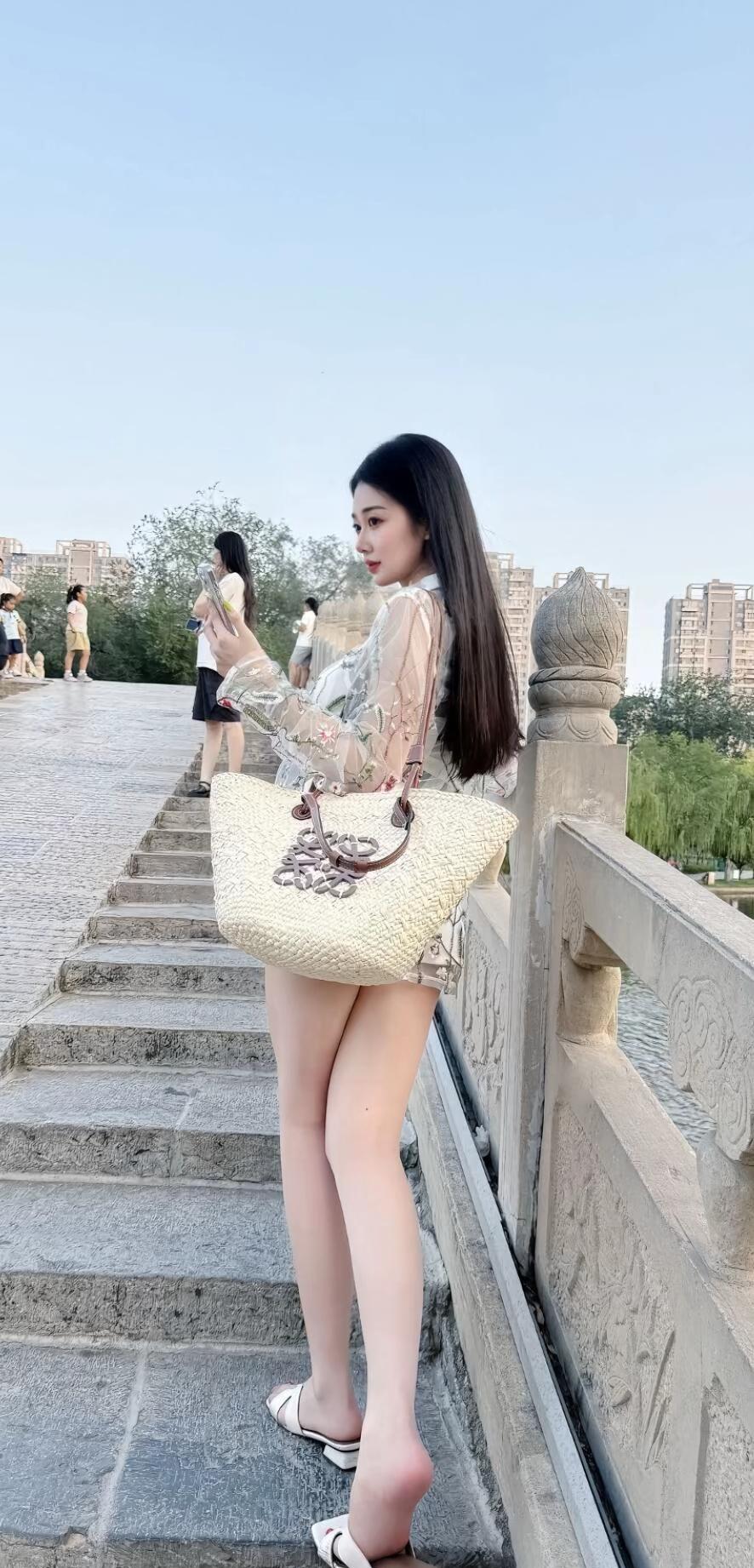 优雅漫步古桥,轻纱飘逸,手提包点缀,尽显都市女性魅力。