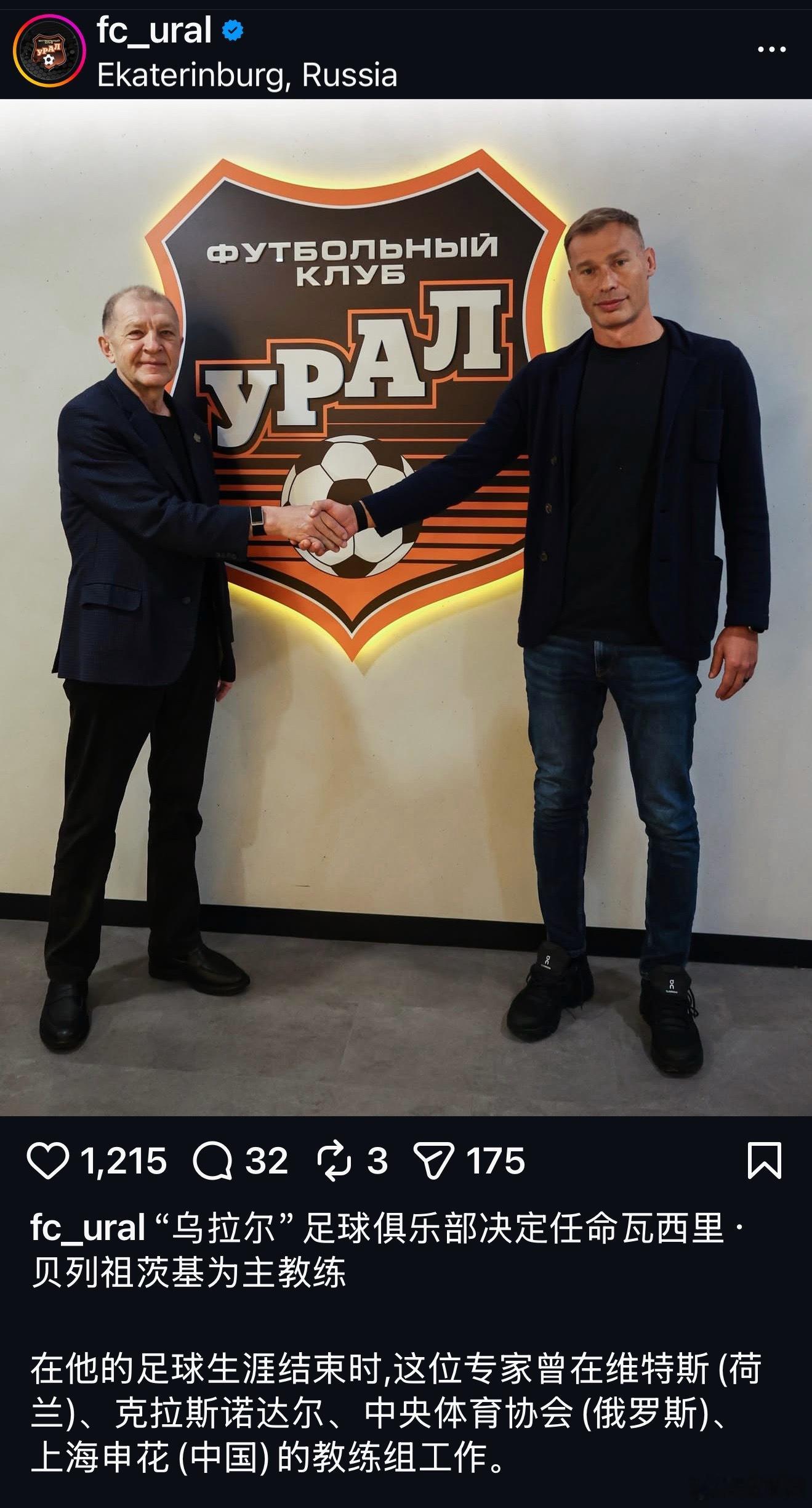 俄甲联赛目前排名第二位于升级区的乌拉尔队,官宣瓦西里·别列祖茨基就任球队新的主教练。乌拉尔队之前连续多个赛季都在俄超联赛里,主场叶卡捷琳堡体育场可容纳35696人,2023 到 2024 赛季,乌拉尔队最终通过附加赛降入俄甲。上个赛季,他们是俄甲第 4 名,最终未能通过附加赛回到俄超。本赛季到目前为止,排名俄甲联赛的第二名。瓦西里的执教目标,应该是要带领球队成功升超。