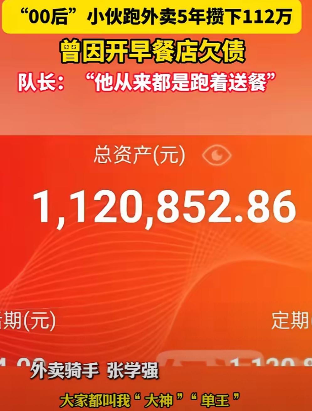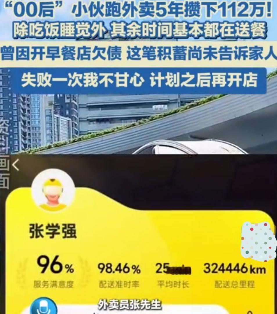 送外卖的和不送外卖的都沉默了! 00后小伙称在上海跑外卖,5年存下了112万元,每天跑超过百单,两个月只休息1天,每个消费控制在四千以下。 按照他的说法,网友粗略算了一下账: 5年112万,一年就35万,一个月2.9万,每天940元,假设一单5块钱,每天都得跑199单。 一单用时20分钟,199单要花3830分钟,一天才1440分钟,不上厕所不吃饭一天也不休息,时间也对不上。 据小伙所述,他早上十点出门接单,晚上11点多回家,一天跑单13个小时,送100单左右,日收入在800元左右。 另外不社交,唯一的花销就是租房1800元,吃饭花费1500元,晒出的存款截图确实有那么多,站点的站长和同事也证实他跑单很拼。 直到他的视频火了之后,他又改口说五年前送外卖单价高,还有补贴、好评奖励、加班费,每年收入有25万余元,再加上平台补贴、打赏、存款利息,全算一起才有这么多钱。 说来说去还是有水份,超负荷工作虽然赚到了钱,亏空的是身体,精神可嘉,但这样的工作方式不值得推崇。 当前很多外卖小哥质疑,有的说:累死也挣不到,真能挣到这么多钱,都挤去跑外卖了。 也有的说:“一年能攒10万已经很不得了了,上次有个外卖小哥说3年存了102万,这又来个5年存112万,不可信。 对此,大家觉得可能吗? 外卖小哥收入 沪漂外卖小哥