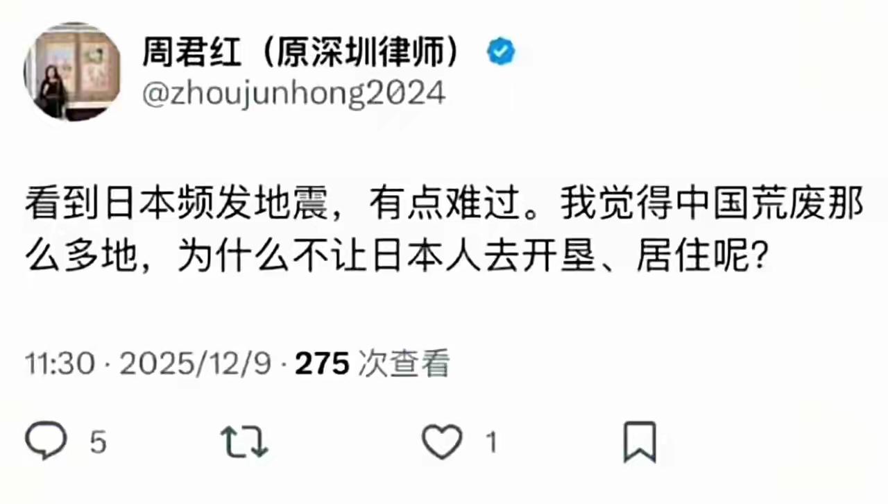 谁给你的勇气这么说的?这个深圳的周律师,日本地震你就难过了吗?你甚至还觉得中国有那么多荒地,还为什么不让日本人去开垦居住?你到底是中国人还是日本人? 中国的土地是中国的,当年日本人对中国同胞这么残暴的杀害,你就没有难过吗? 那你把你的家让给日本人住吧!把你所有的一切都贡献给日本人吧! 日本人的狼子野心可没你想象那么简单!温室里面长大的人永远不知道什么叫痛苦!像这样的人就应该去经历一下所谓的战争!所以现在很多人没有吃过苦,不知道什么叫痛苦!只怪中国太强大,把这些人保护的太好了!甚至让有些人开始有点叛逆了