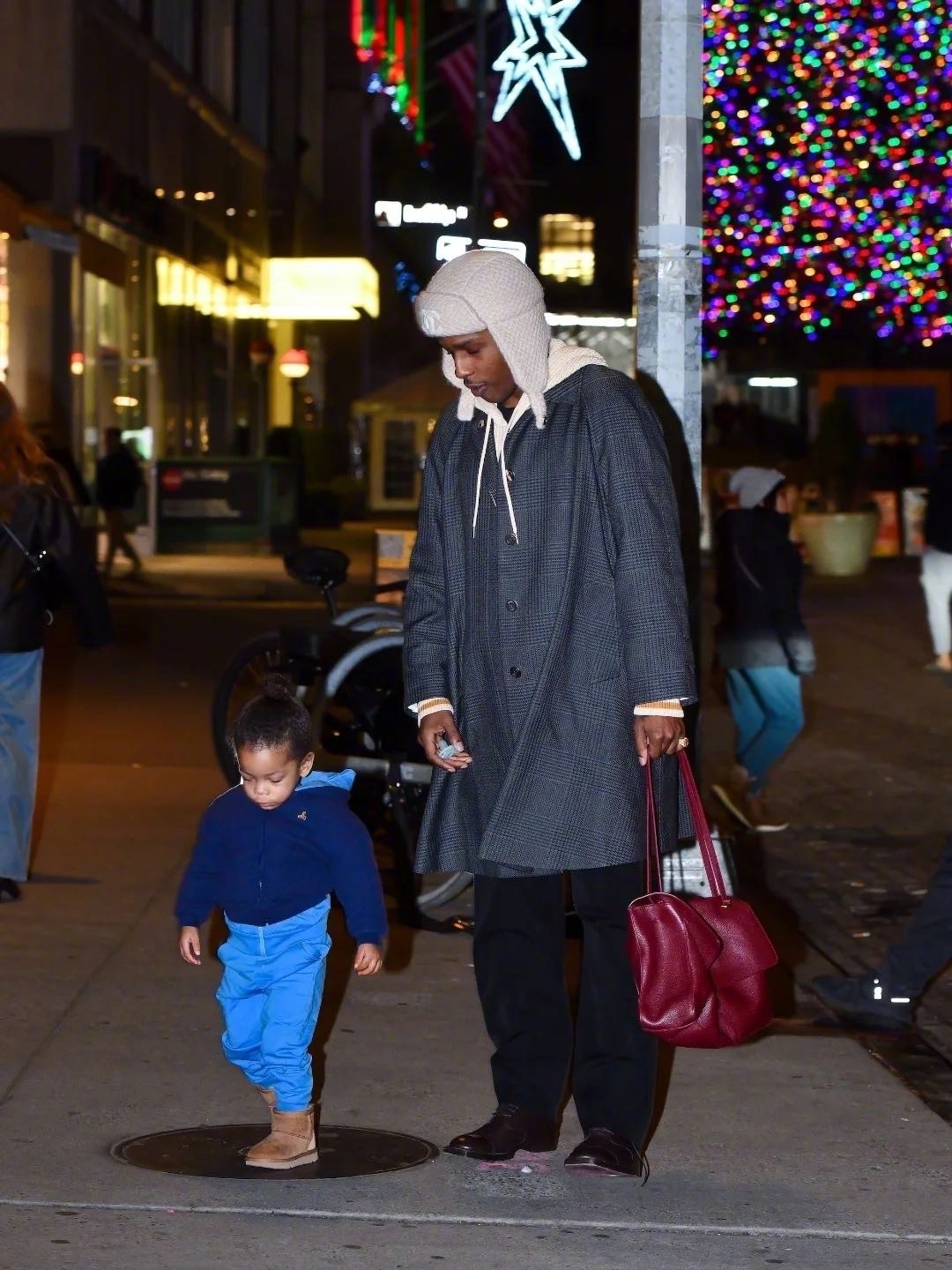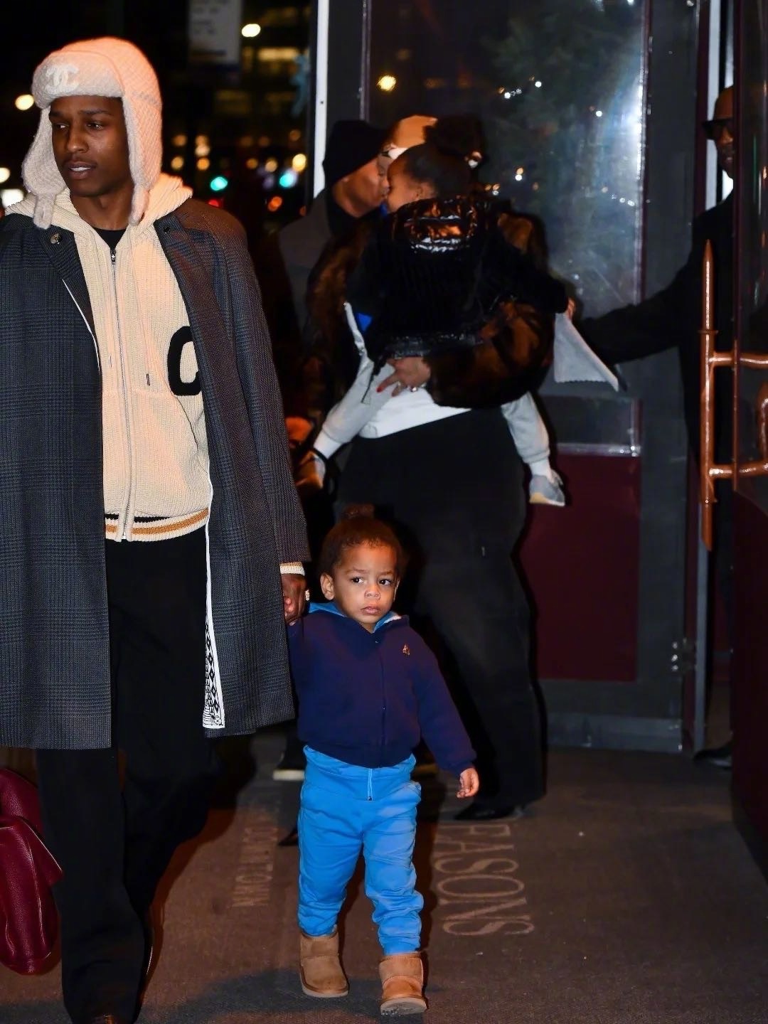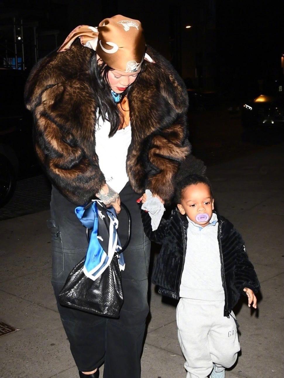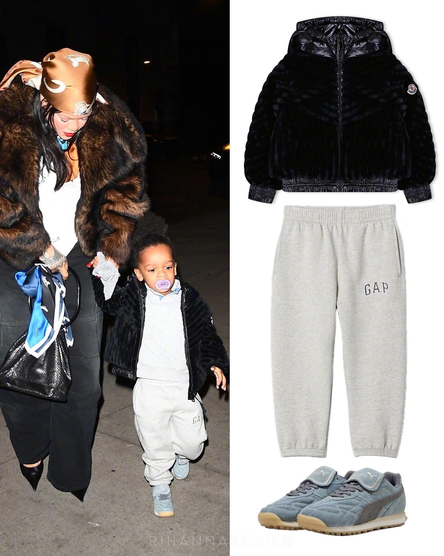 著名女企业家蕾哈娜 和男友带着俩儿子外出游玩被拍。老大RZA的安抚奶嘴还没戒掉,身穿的是Moncler 夹克,和 GAP 运动裤,脚穿 Puma x Fenty Smurfs 运动鞋。米拉服饰解析