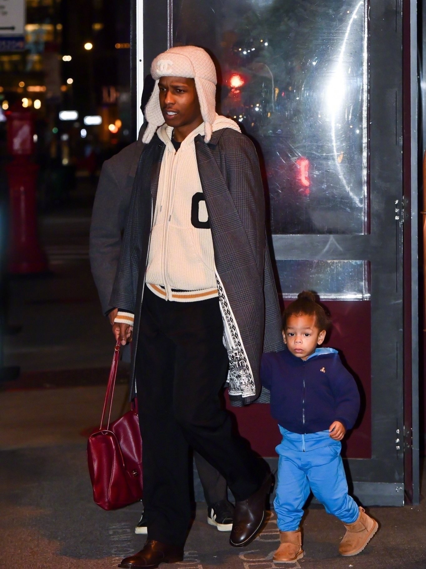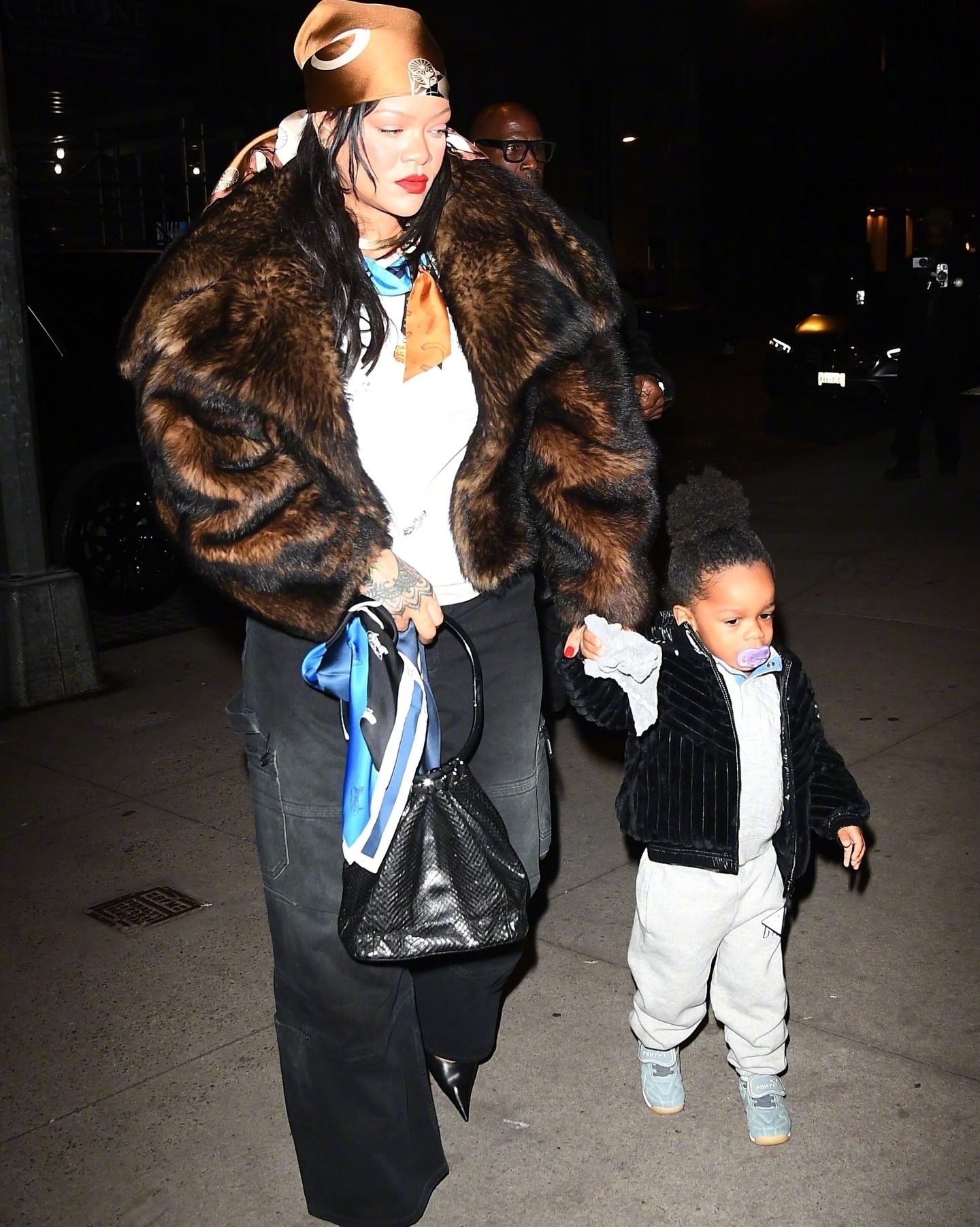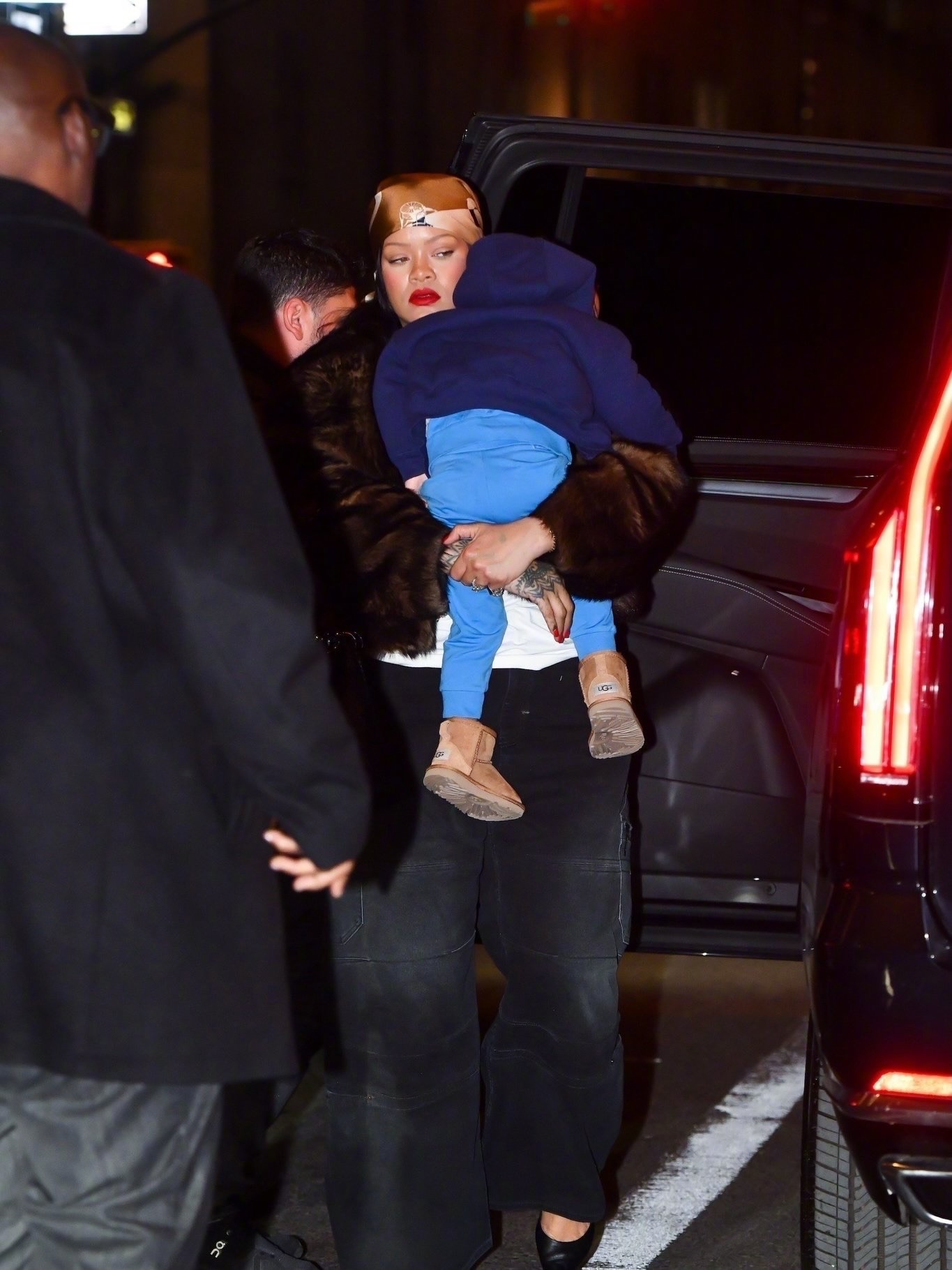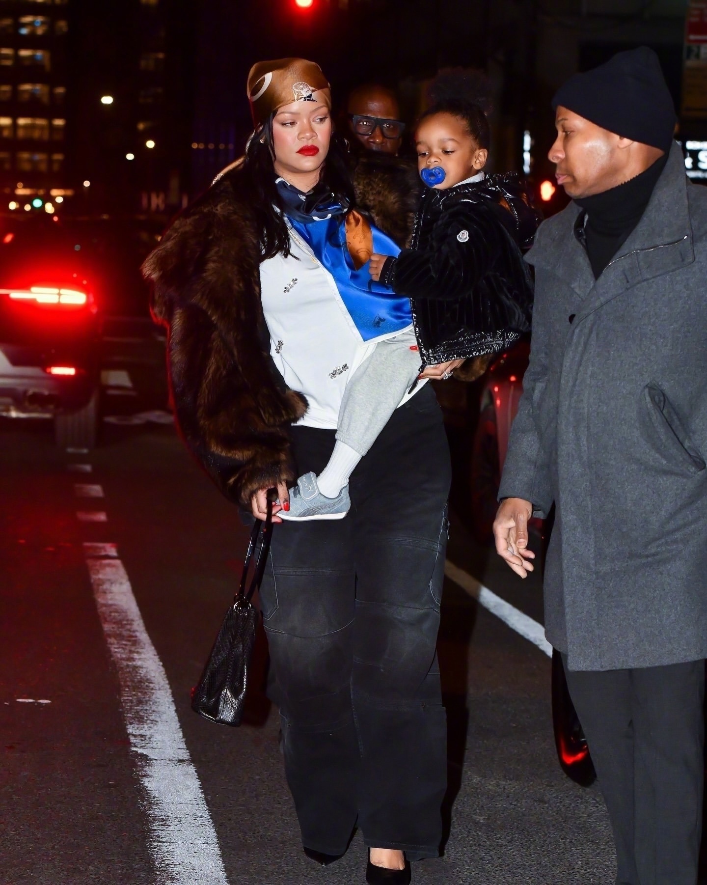 著名女企业家蕾哈娜 和男友带着俩儿子外出游玩被拍。老大RZA的安抚奶嘴还没戒掉,身穿的是Moncler 夹克,和 GAP 运动裤,脚穿 Puma x Fenty Smurfs 运动鞋。米拉服饰解析