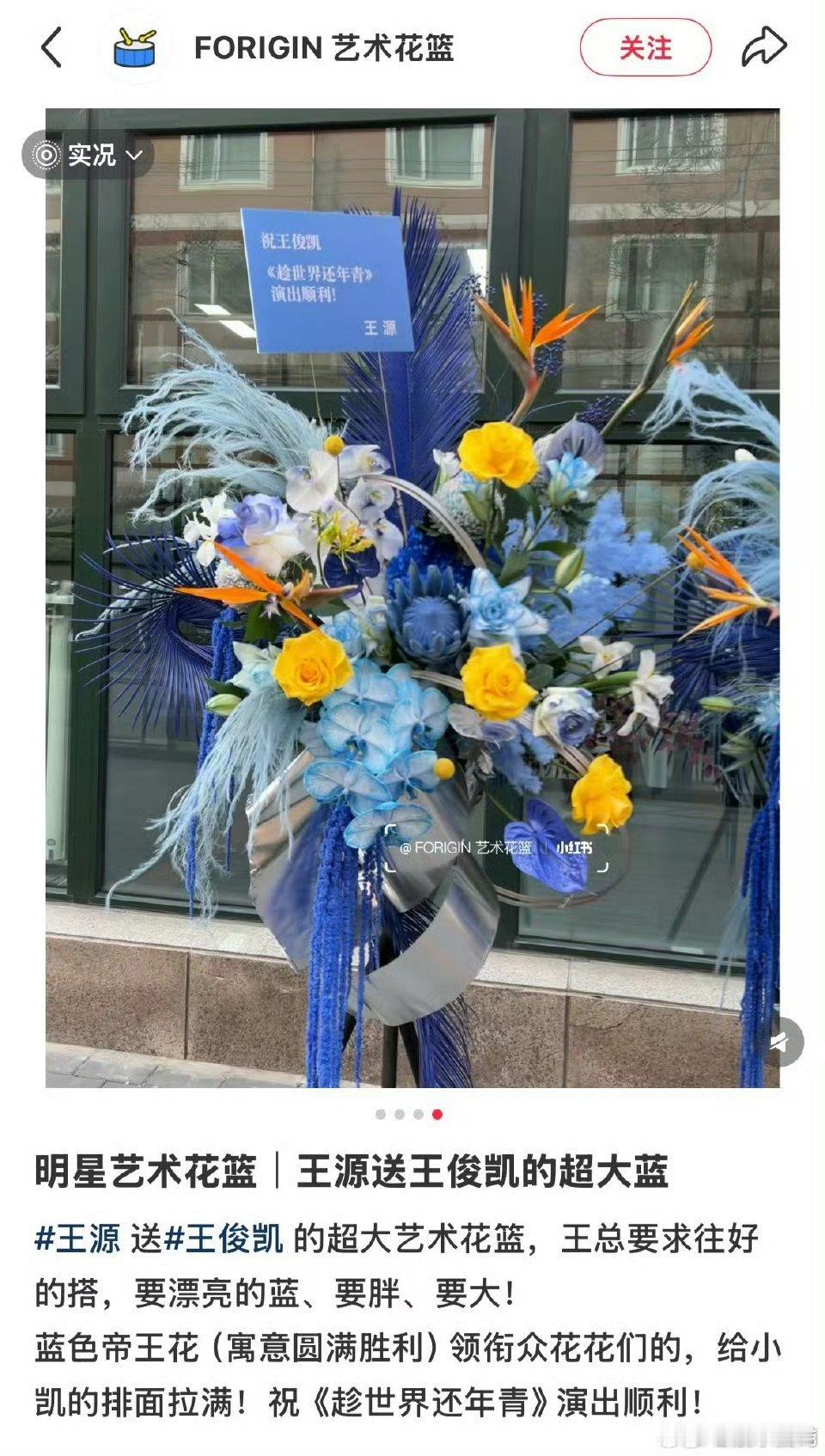 王源儿给王俊凯话剧送花篮,要求店家往好的搭,要漂亮的蓝、要胖、要大!太爱了!