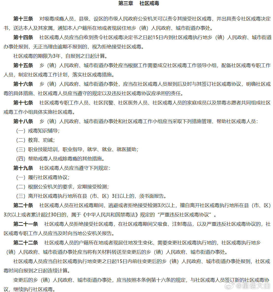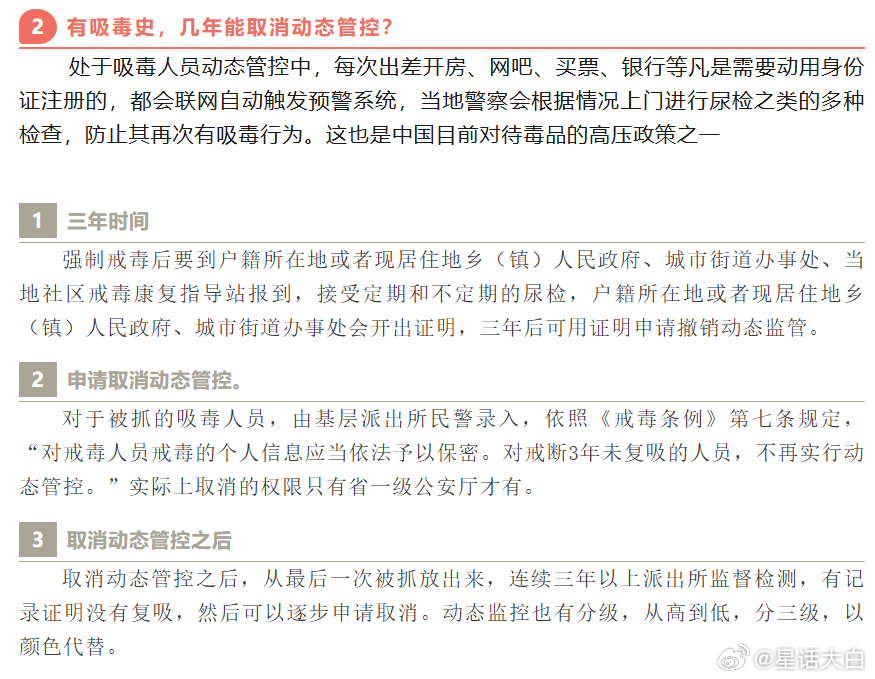 我国对涉毒人员施行动态管控,被录入的吸毒人员使用与本人真实身份相关的证件,比如身份证,该系统都会自动预警,辖区内的警务机构会在第一时间内赶到现场,对当事人进行动态跟踪管理盘查,以此减低毒品违法犯罪率。这套动态管控系统是十分严格的。比如,一个吸毒人员在某个辖区使用身份证,如乘飞机、坐火车、住旅店、进网吧、去银行等,该辖区的警察都能及时得到信息反馈。辖区警察会立即来请回去进行验尿,以确定是否吸毒。并且,自愿戒毒、社区戒毒、强制隔离戒毒,申请解除动态管控的门槛也不一样。《戒毒条例》第九条规定:“国家鼓励吸毒成瘾人员自行戒除毒瘾。吸毒人员可以自行到戒毒医疗机构接受戒毒治疗。对自愿接受戒毒治疗的吸毒人员,公安机关对其原吸毒行为不予处罚。”第十三条规定:“对吸毒成瘾人员,县级、设区的市级人民政府公安机关可以责令其接受社区戒毒,并出具责令社区戒毒决定书,送达本人及其家属,通知本人户籍所在地或者现居住地乡(镇)人民政府、城市街道办事处。”社区戒毒的期限为3年,自报到之日起计算。社区戒毒人员在社区戒毒期间,逃避或者拒绝接受检测3次以上,擅自离开社区戒毒执行地所在县(市、区)3次以上或者累计超过30日的,就属于严重违反社区戒毒协议,需要被送去强制隔离戒毒。此外,吸毒人员拒绝社区戒毒,在社区戒毒期间吸食、注射毒品的,都要被送去强制隔离戒毒。《戒毒条例》第27条规定:“强制隔离戒毒的期限为2年,自作出强制隔离戒毒决定之日起计算。”“被强制隔离戒毒的人员在公安机关的强制隔离戒毒场所执行强制隔离戒毒3个月至6个月后,转至司法行政部门的强制隔离戒毒场所继续执行强制隔离戒毒。”通常来说,吸毒人员如果能在社区戒毒期间表现良好,定期完成尿检检测,那么在3年的社区隔离期满,就能申请解除动态管控。但如果吸毒人员被送去强制隔离戒毒,首先需要完成2年的强制隔离戒毒,然后还要去完成3年的社区康复,才能申请解除动态管控。有报道咨询了各地缉毒民警关于动态管控系统的录入和退出,即使三年期满,也会因为涉及权限、程序、考核、评估、管理等多个因素造成退出困难,就算已经退出动态监控系统,其吸毒记录是永远存在的,等于有了吸毒终身牌照。此外,报道里还提到:“如果在管控期内,多次查处没有发现吸毒迹象就会降级处理,不再频繁的检查行踪,但不代表解除管控。但是如果在管控中发现有复吸迹象,那么后果将更加严重,以后也不会有什么降级、退出系统之说,首要任务就是送往强制戒毒所进行隔离。”只要吸毒人员复吸,这个动态管控的3年戒断期就会重新计算。而这套动态管控系统,是基于《戒毒条例》的条文和《禁毒法》的精神,不会因为其他法律而取消。我国吸毒之所以没有入刑,恐怕主要也跟这套严格的“动态管控”系统有关,因为只要复吸就会被送去强制隔离戒毒,在我看来,强制隔离戒毒跟坐牢也没有太大区别。由于吸毒人员很容易复吸,所以对吸毒人员就应该严格管理,这套动态管控系统是非常有必要的。也正因为有这套动态管控系统,我国戒毒工作才能取得较大成效。《2015年中国毒品形势报告》披露,现有吸毒人员234.5万名,全年查处吸毒人员106.2万人次,新发现53.1万名。《2024年中国毒情形势报告》披露,现有吸毒人员74.7万名,戒断三年未发现复吸人员433.9万名,全年查处吸毒人员19.3万人次。这个成果是建立在我国对吸毒人员的严格管控基础上。不能拿严格管控的成果,来质疑严格管控的必要性。所谓“治安违法记录封存”,更加不能影响到对吸毒人员的动态管控。毒品在全球范围内是牵扯到巨大的利益,所以欧美长期被相关利益集团推动毒品去罪化、毒品无害化,结果导致当前欧美毒品泛滥。我国历史上遭受过毒品的巨大伤害,现在还有欧美这样现成的反面案例摆在那,无论如何都不能放松对吸毒人员的管控,不能放松对涉毒违法犯罪行为的打击力度。这些涉毒利益集团,也在长期千方百计试图撬开我国大门。任何试图去弱化毒品危害的声音,试图鼓吹放松对吸毒人员管控的声音,都可以合理怀疑有这些利益相关因素。但这些人注定不会成功。我国打击毒品的力度从未放松过,禁毒是我们的一项基本国策,对于我国会继续严厉打击毒品,我们还是应该有信心,不用因为这次的事情而感到焦虑。禁毒是全民共识,任何挑战这个共识的人,就是中国人民的敌人。可以确定的是,过去我们对吸毒人员怎么管理,未来我们对吸毒人员还是会同样严格管理,不会放松。这一点大家可以放心。