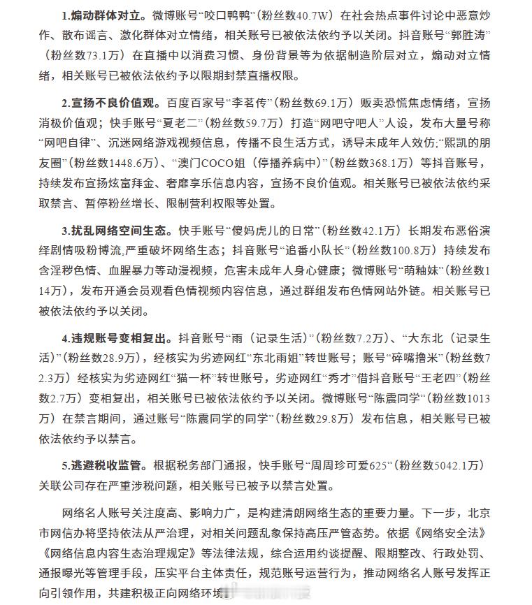 【官方通报劣迹网红变相复出】今日(12月12日)21时许,北京市网信办通报“依法查处一批网络名人账号”。为进一步规范网络名人账号信息传播秩序,近期,北京市网信办启动“清朗京华·网络名人账号乱象整治”专项行动,指导网站平台重点整治煽动群体对立、宣扬不良价值观、扰乱网络生态、违规账号变相复出、逃避税收监管等突出问题。现将部分典型案例通报如下: