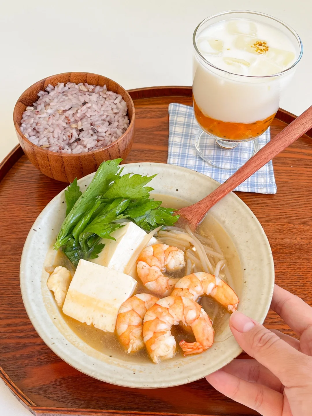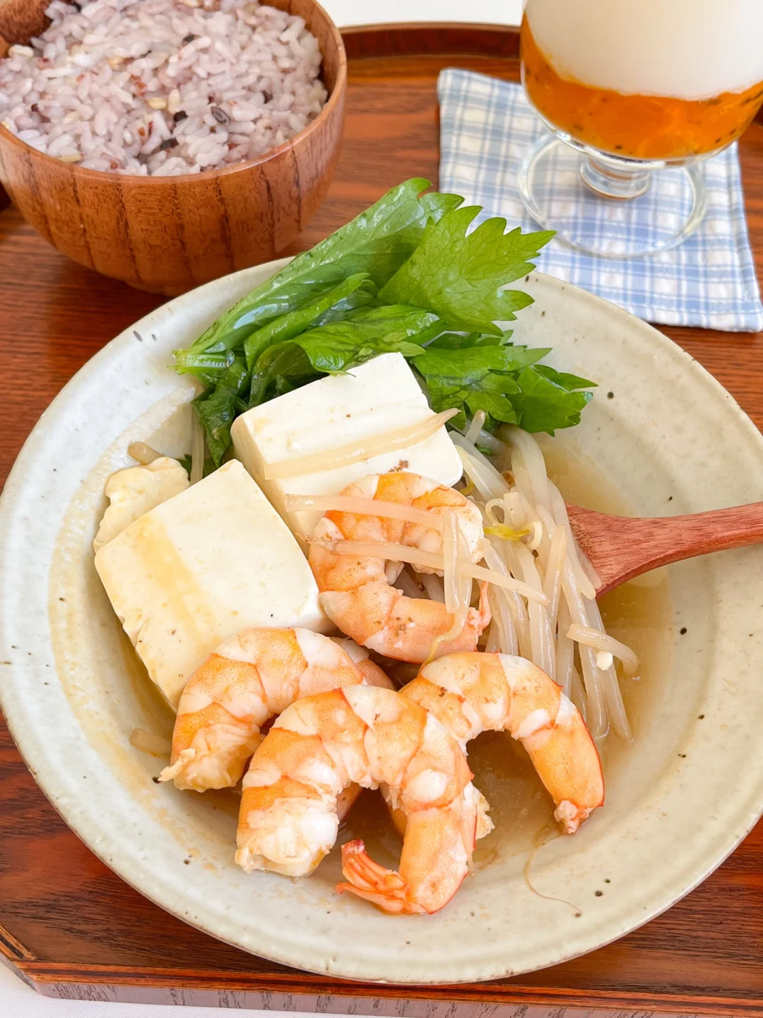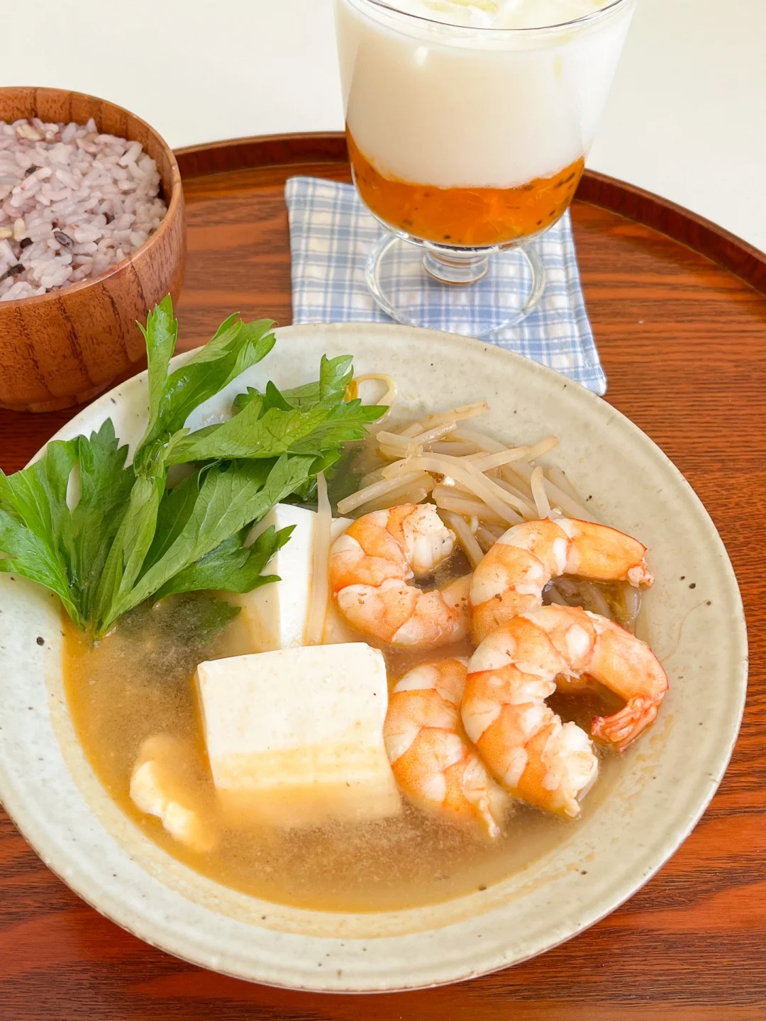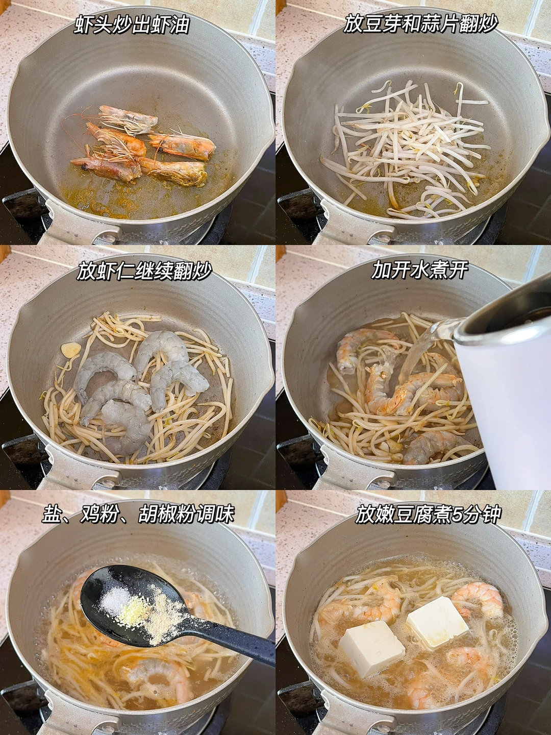 “今天的午餐特别简单,不会做饭也没关系,只要把食材煮熟就行!花上十分钟就能做好一锅美味,连汤一起喝暖暖的还能吃饱~” 今日午餐: ¹鲜虾豆腐豆芽汤 ²杂粮米饭 ³柿子桂花冰奶 ▪️做法: ❶鲜虾去壳去虾线,加盐和白胡椒粉 ❷嫩豆腐切块,准备绿豆芽 ❸锅里放油先把虾头煎出油,放蒜末炒豆芽 ❹翻炒均匀放虾仁,炒变色加水煮开 ❺盐、白胡椒粉、鸡粉调味,最后放芹菜叶或香菜叶,淋上适量香油出锅