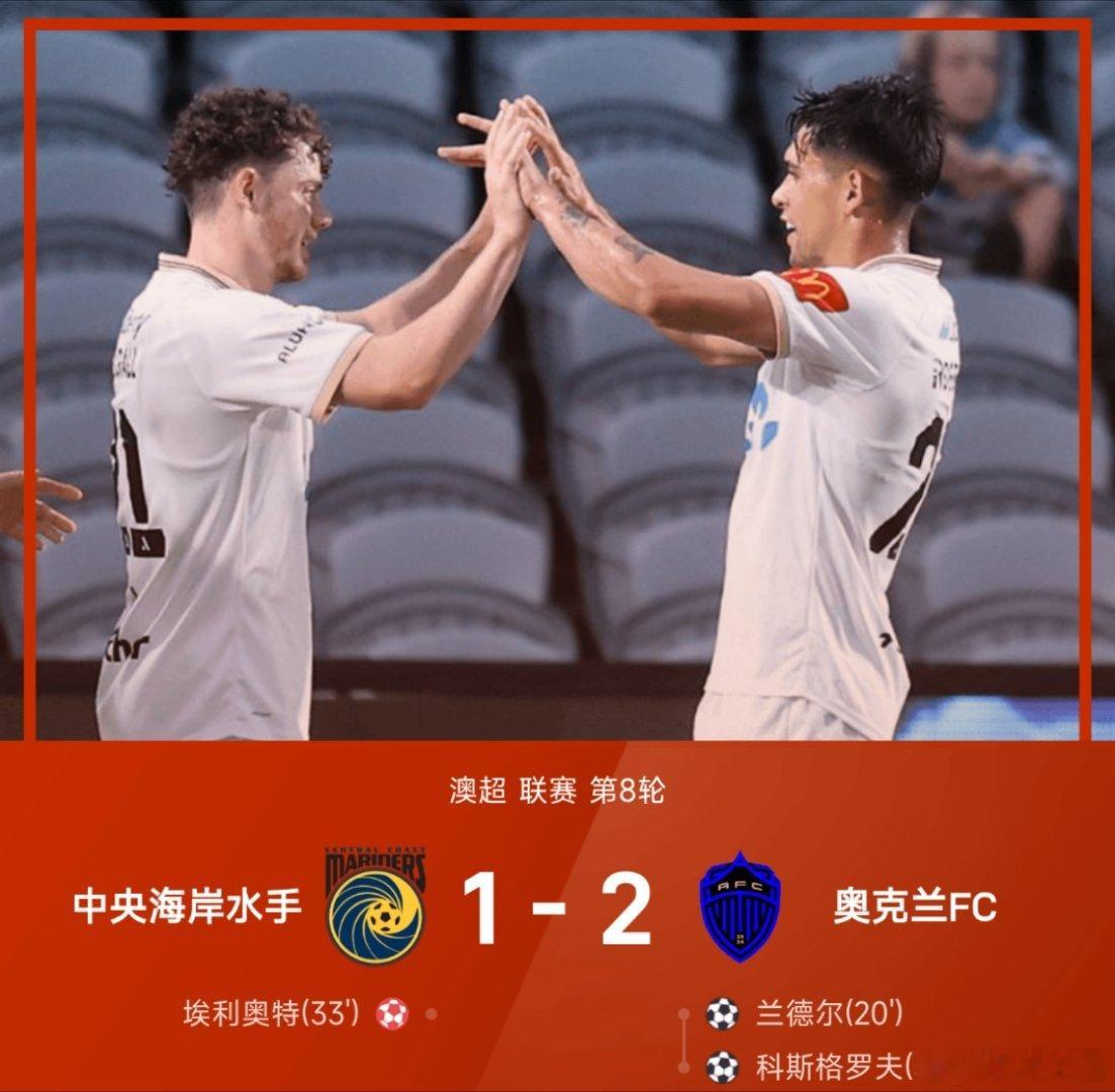 奥超战报:科斯格罗夫制胜,奥克兰FC 2-1中央海岸水手 25/26赛季澳超联赛第8轮,奥克兰FC2-1战胜中央海岸水手。上半场比赛,兰德尔抽射建功,随后埃利奥特头球攻破自家大门帮水手扳平。下半场易边再战,科斯格罗夫鱼跃冲顶破门,帮助奥克兰客场全取三分。