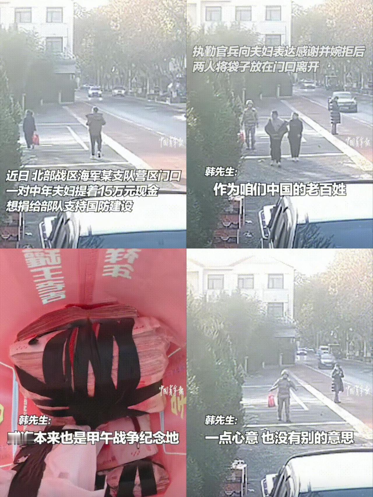 格局太大了! 山东威海,夫妻俩拿着个手提袋送到了北部战区海军支队营区门口, 士兵还以为他俩要寻求帮助呢,万万没想竟然是捐给部队15万元现金用于支持国防建设! 士兵忙着婉拒,夫妻俩放下袋子就大步流星离开,脸上的笑容比啥都真诚。这15万或许够不上国防建设的零头,却比千万巨款更有分量。爱国从不是豪言壮语,而是普通人把国家放在心上,把拥军落到实处的本能。 威海作为甲午战争纪念地,这里的人更懂“国强家安”的道理。他们的举动不是一时冲动,而是 generations 传承的朴素信仰:军队守护我们的安宁,我们就做军人最坚实的后盾。 这种双向奔赴的信任,才是国家最硬的底气! 对于国防建设来说可能15万元只是凤毛麟角,但是夫妻俩这种做法的效果堪比15个亿!