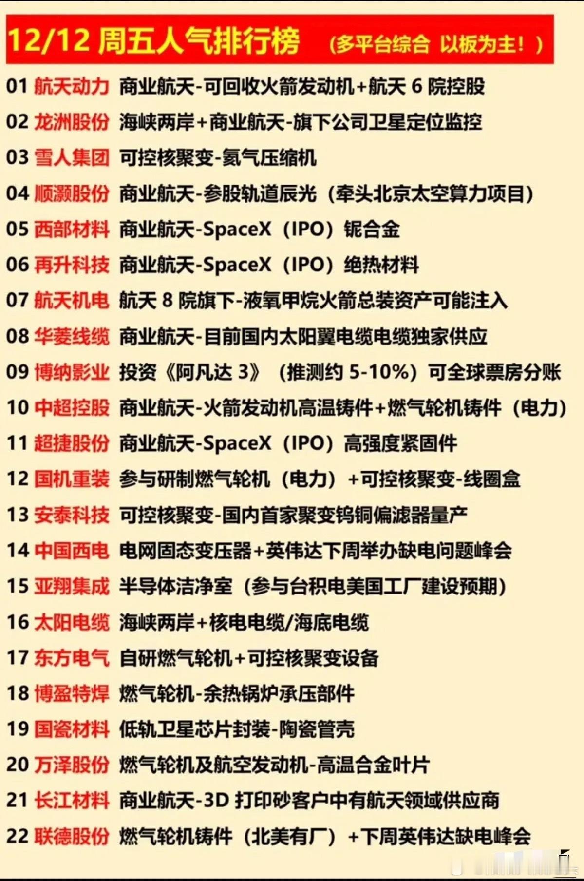 12月12日的人气排行榜梳理分析!本次梳理以多平台综合分析且以涨停板为核心维度,商业航天是绝对主线,超半数个股覆盖该赛道的材料、零部件、整机及细分应用环节,还叠加SpaceX IPO、可回收火箭等热点;可控核聚变、燃气轮机/电力、半导体及海峡两岸、英伟达缺电峰会等主题同步上榜,个股多为赛道细分核心标的,反映市场对高端制造硬核赛道的高度追捧。个股梳理分析1. 航天动力:核心是商业航天,主打可回收火箭发动机且由航天6院控股,依托航天院所的技术背景,成为商业航天领域的核心人气龙头,赛道核心地位显著。2. 龙洲股份:叠加海峡两岸与商业航天概念,旗下公司做卫星定位监控业务,区域题材与热门赛道形成共振,凭借题材叠加效应获得高市场关注度。3. 雪人集团:聚焦可控核聚变赛道,核心产品是氦气压缩机,作为核聚变领域的关键设备供应商,赛道稀缺性推高了其市场人气。4. 顺灏股份:主打商业航天,参股轨道辰光且牵头北京太空算力项目,卡位太空算力这一商业航天新兴细分方向,成为赛道内的人气标的。5. 西部材料:绑定商业航天与SpaceX IPO概念,核心产品为铌合金,是航天特种金属材料的重要供应商,赛道与国际热点叠加提升了人气。6. 再升科技:聚焦商业航天与SpaceX IPO,核心是绝热材料,作为航天装备的关键材料供应商,材料端的核心地位使其获得市场关注。7. 航天机电:隶属航天8院旗下,有液氧甲烷火箭总装资产注入预期,背靠航天院所且叠加资产整合预期,成为商业航天人气标的。8. 华菱线缆:主打商业航天,是国内太阳翼电缆的独家供应商,产品的独家供应属性让其成为商业航天配套领域的人气股。9. 博纳影业:因投资《阿凡达3》(推测占比5-10%)可参与全球票房分账,影视IP的热度使其在硬核赛道榜单中占据一席之地。10. 中超控股:叠加商业航天与电力概念,主营火箭发动机高温铸件、燃气轮机铸件,是航天与电力装备的核心零部件供应商,双赛道加持获关注。11. 超捷股份:绑定商业航天与SpaceX IPO,主营高强度紧固件,是航天装备的核心零部件供应商,细分领域的核心地位推高了人气。12. 国机重装:叠加电力与可控核聚变概念,参与燃气轮机研制且主营核聚变线圈盒,双赛道布局使其成为高端制造人气标的。13. 安泰科技:聚焦可控核聚变,是国内首家实现聚变钨铜偏滤器量产的企业,技术量产优势使其成为核聚变赛道人气股。14. 中国西电:主打电网固态变压器,且英伟达下周将举办缺电问题峰会,电力设备与科技峰会主题叠加,获得了市场关注。15. 亚翔集成:聚焦半导体洁净室,还有参与台积电美国工厂建设的预期,半导体基建的核心属性使其成为赛道人气标的。16. 太阳电缆:叠加海峡两岸与核电/海底电缆概念,区域题材与电力装备赛道共振,成为线缆领域的人气标的。17. 东方电气:自研燃气轮机且布局可控核聚变设备,高端装备制造与核聚变赛道双布局,获得了市场高关注度。18. 博盈特焊:主打燃气轮机领域,主营余热锅炉承压部件,是燃气轮机装备的核心配套商,细分领域优势推高了人气。19. 国瓷材料:聚焦低轨卫星芯片封装,主营陶瓷管壳,是卫星芯片封装的核心材料供应商,卡位航天半导体细分赛道获关注。20. 万泽股份:布局燃气轮机及航空发动机,主营高温合金叶片,是高端发动机的核心零部件供应商,硬核制造属性获人气。21. 长江材料:主打商业航天,其3D打印砂的客户包含航天领域供应商,间接卡位商业航天供应链,获得了市场关注。22. 联德股份:主营燃气轮机铸件且北美有生产基地,还叠加英伟达下周缺电峰会主题,赛道与热点事件共振成为人气标的。总结今日人气榜清晰展现出商业航天是当前市场最核心的人气主线,产业链上下游的材料、零部件、整机及新兴细分(太空算力)标的均获高关注,叠加SpaceX IPO、院所资产注入等预期的标的更受青睐;可控核聚变、燃气轮机/电力等高端制造赛道同步分流人气,而区域题材、行业峰会等事件性主题与硬核赛道的叠加,进一步放大了个股的市场关注度。本文涉及资讯、数据等内容来自网络公共信息,仅供参考,不构成投资建议!