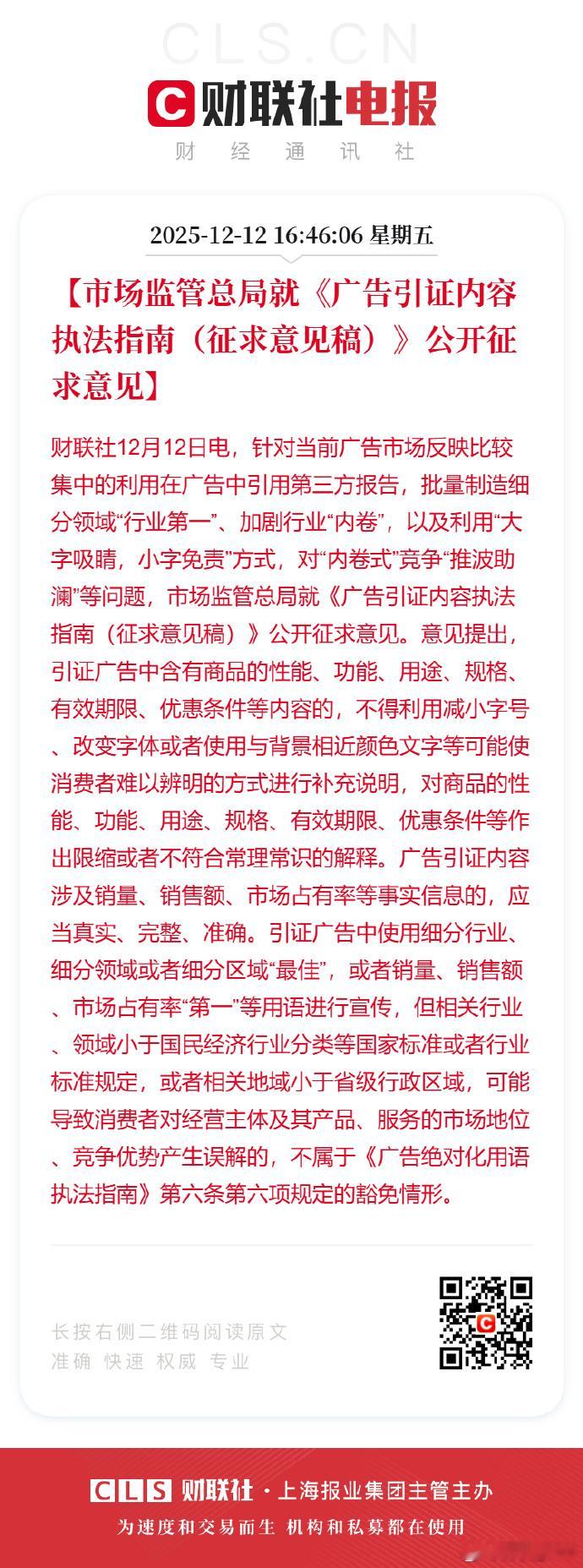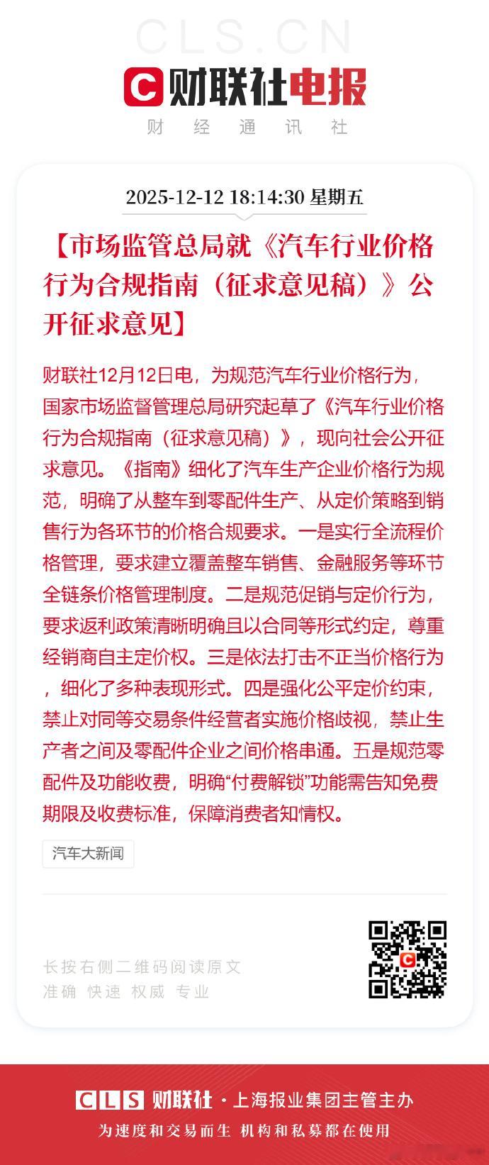 市场监管总局连发两则征求意见稿。一是要求规范广告,不得“大字吸睛,小字免责”,也不得用定语编排「第一」榜单。二是要求车企规范价格,不得采用压低标价,故意低于成本价销售。反内卷的刀,也需要来一次真刀真枪的杀鸡儆猴。