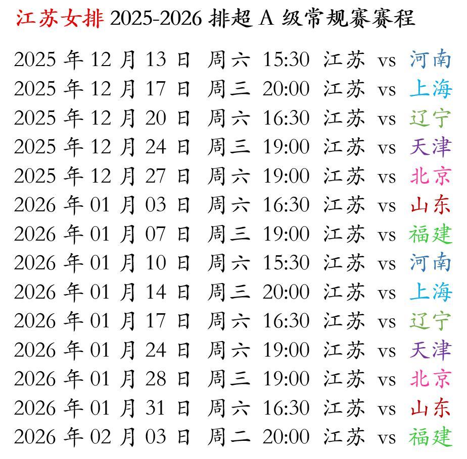 15:30 年轻的江苏中天钢铁女排Vs河南双汇女排 全运会开完了,有的女排俱乐部教练下课,有的运动员留洋,有的掛名,有的引外援……,这是新赛季,新起点,必将带来新气象。 A级赛事,八支队伍。(依全运会成绩排序) 江苏,山东,福建,上海,天津,河南,北京,辽宁。 12月12日 2025-2026女排超级联赛正式鸣锣开打,天津女排3:2胜北京女排。 而江苏年轻女排今下午首秀亮相。 江苏中天钢铁俱乐部,龚翔宇、张常宁、刁琳宇虽在23人大名单中,是象征性的。 比赛要正式开始了,14人名出炉!刮起了青春风暴,全部由2001年后出生的选手组成! 主攻: 8号吴梦洁(C),14号唐欣,3号滕蔓绮,22号魏伊彬。 副攻:9号万梓玥,13号杨佳,19号李涵宇,21号郭中楠。 接应:1号范泊宁,5号周页彤。 二传:7号张籽萱,20号施佳宜。 自由人:17号倪非凡,11号陈奕帆。 年轻江苏女排之中有一半是全运会和上届联赛冠军队成员。另外,国手吴梦洁,倪非凡在列。 另一边上海队主教练是蔡斌,这可是江苏女排原教练,更是国家女排前主教练! 他的出山,意图十分显目,协助上海女排夺取联赛冠军! 考验年轻江苏女排实力的时候到了! 奥运冠军张常宁会出现在教练席吗? 12月13日 15:30 江苏中天钢铁Vs河南双汇