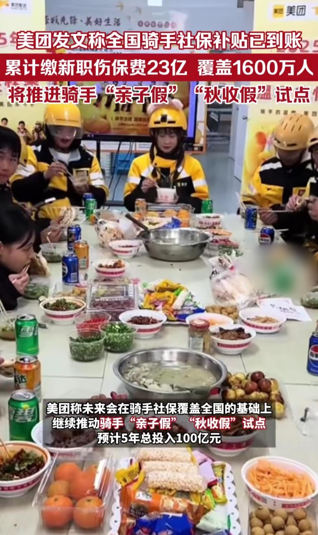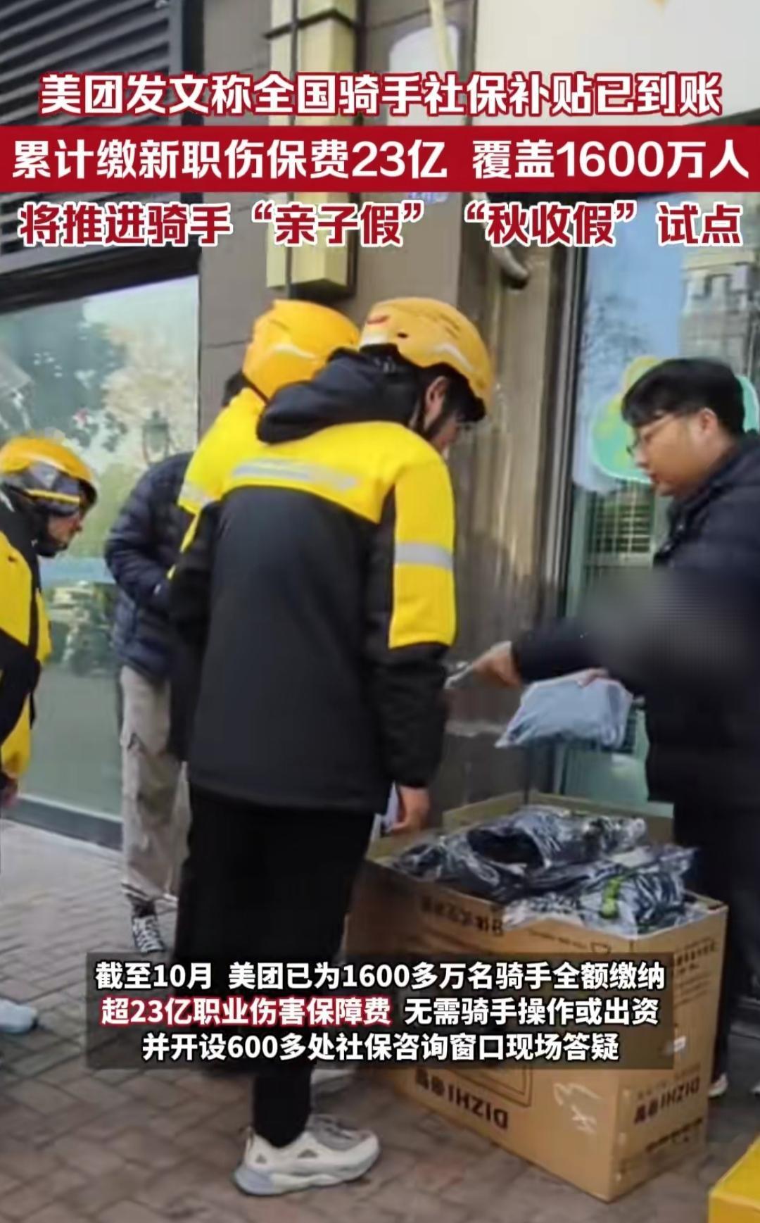 风里来雨里去的外卖骑手,现在也能稳稳拿到社保补贴了?美团23亿职伤保费已集中到账,覆盖1600万人,还要推亲子假、秋收假,这波操作让无数打工人破防! 骑手这份工作看着自由,实则藏着太多不确定:路上的交通安全、长期奔波的身体损耗,最让人揪心的就是没保障。现在平台主动扛起责任,社保补贴覆盖专送和众包,还能自选参保地,真的戳中了骑手们的痛点。 其实劳动者的幸福很简单,无非是辛苦付出能有兜底的保障。美团这100亿的五年保障计划,不只是钱的投入,更是对灵活就业群体的尊重与关怀。希望更多平台能跟上,让每一份奔波都有温度,每一位劳动者都能安心打拼。