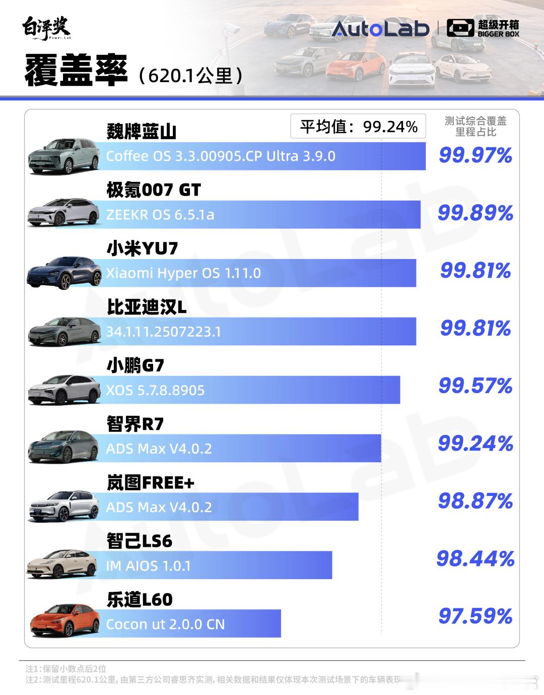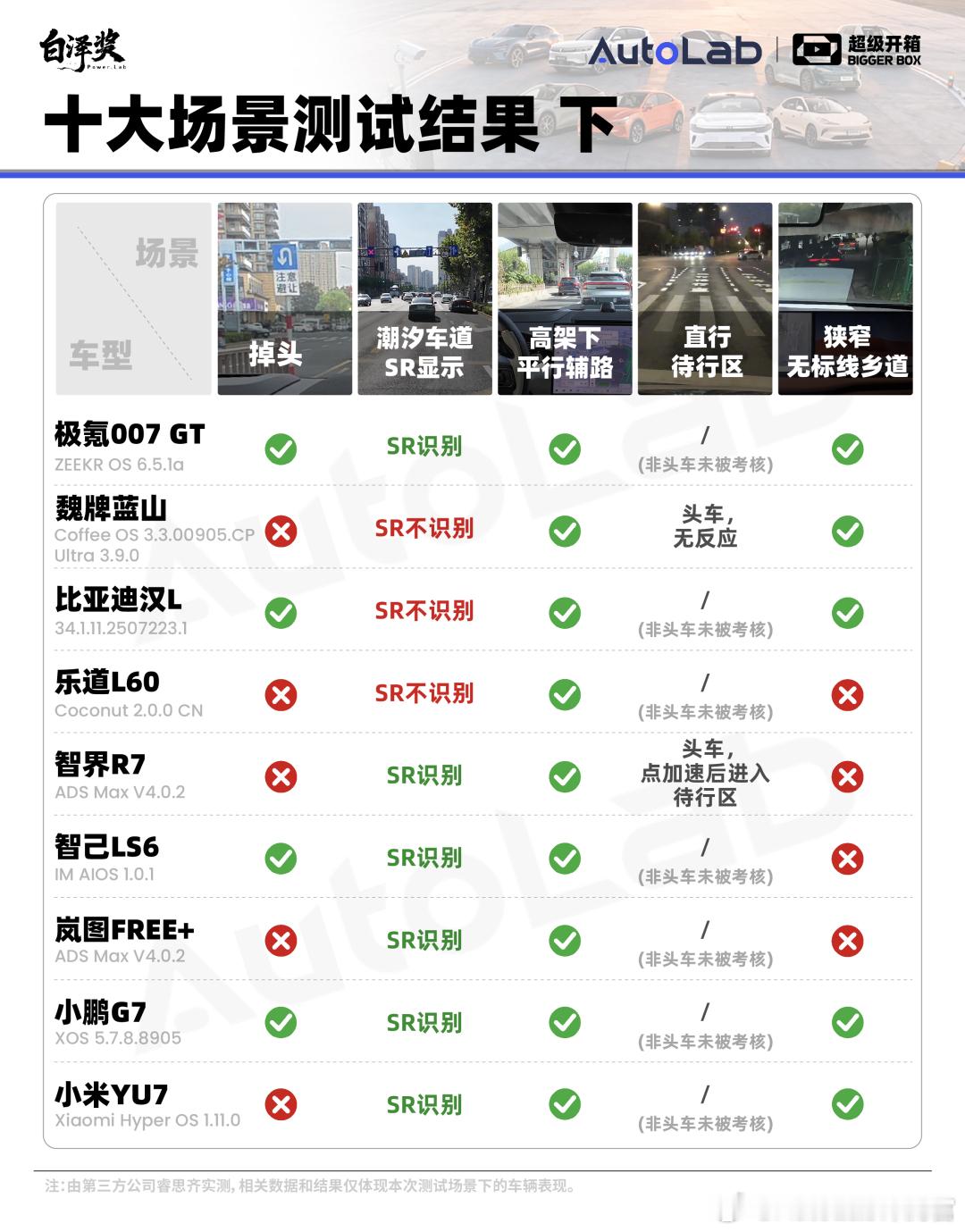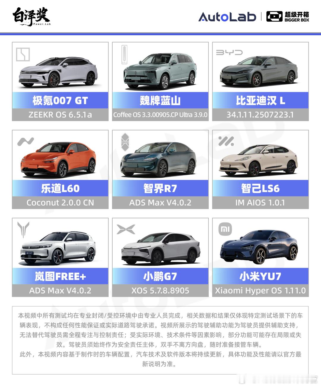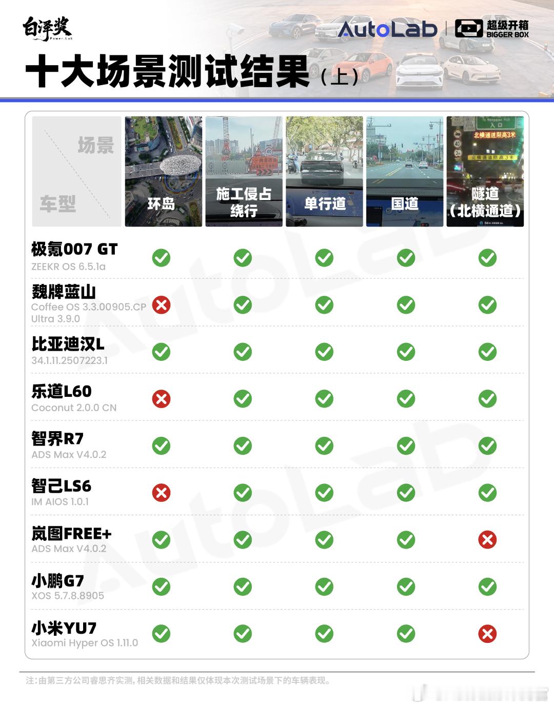 本期白泽奖我们聚焦在20-30万级的选手。包括极氪007GT、魏牌蓝山、比亚迪汉L、乐道L60、智界R7、智己LS6、岚图FREE+、小鹏G7、小米YU7。这次依然是全场景评测,包含了城区领航、高速领航、主动安全以及智能泊车功能。其中城区领航分为真实路测和在封闭场地进行的危险场景还原,绝对是全网量最大的评测,供各位对辅助驾驶功能感兴趣的朋友们参考。这一期,我们先看看9车的城市NOA表现。为了结果的准确性,我们采用了“题海战术”,比如城区领航路测部分,我们驾驶九车在广州、上海、深圳、苏州、宜兴、溧阳这六座风格各不同的城市共计跑了620.1公里,基本覆盖了大家日常会遇到的各种路况。经过我们实测,总分250分,智界R7得分最高,为166.76分,9款车的城市NOA平均得分则为82.1分。(图二)另外,从一线城市到四线城市,这9款车型的城区领航功能基本全程可开启。(图三)与此同时,它们具体完成了哪些路段的通行?是否游刃有余?我们还列出了十大场景,包括环岛、施工、单行道、国道等。(图四、五)。9款车面对这些场景,有的能全部通过,有的竟然会“阵亡”一半,并且没有一款车能顺利通过全部场景。AutoLab大V聊车