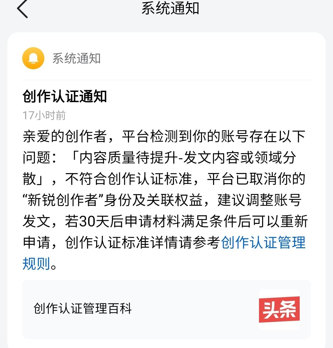 自尊心被“打击”到了!昨天下午,突然收到头条发来的“系统通知”,取消了我的“新锐创作者”的身份。讲真,我看到这条通知内心还是挺失落的。 取消“新锐创作者”认证的原因是说我的发文内容或领域过于分散,意思是垂直度不够吧? 怎么说呢,取消认证虽然不会对我个人的生活和收入造成明显的影响,但是我确实颇为看重自己在头条这个平台中的位置和被认可度,哪怕只是名誉上的。 这次被取消,说明自己在某垂直领域的认知深度和文字能力或许已经跟不上平台的标准和门槛了。 不过这也未尝不是一件好事儿。至少说明头条对创作者内容质量有了更高的要求。 对于那些看文章的人来说,就少了很多花时间浏览到一些“支离破碎”或“毫无营养”的内容,而这些鱼腩内容会影响到一个人的学习能力和内心丰盈。 但是我同时想说,现在很多领域都不能轻易涉及,好多内容也不能畅所欲言,只能小心翼翼,如履薄冰。 对于普通创作者来说,如果只能垂直在某一个具体细分领域是否稍微有些“严苛”了。 毕竟,有深度IP的人往往不是自己在“操刀”,因为TA们压根没时间;而有时间的人可能早就远离领域前沿,因为退休了。 但文字创作这种东西不像是拍短视频,很多时候需要本人去写才能真正的“原汁原味”。 无论如何,这对我也是个鞭策。希望以后有机会重试“新锐创作者”这个既不重要又很重要的虚拟头衔!