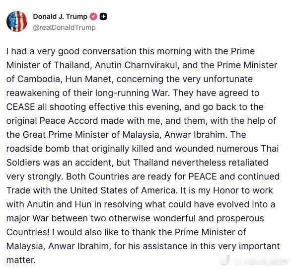 特朗普声称泰国与柬埔寨同意停火,并恢复原有和平协定。
