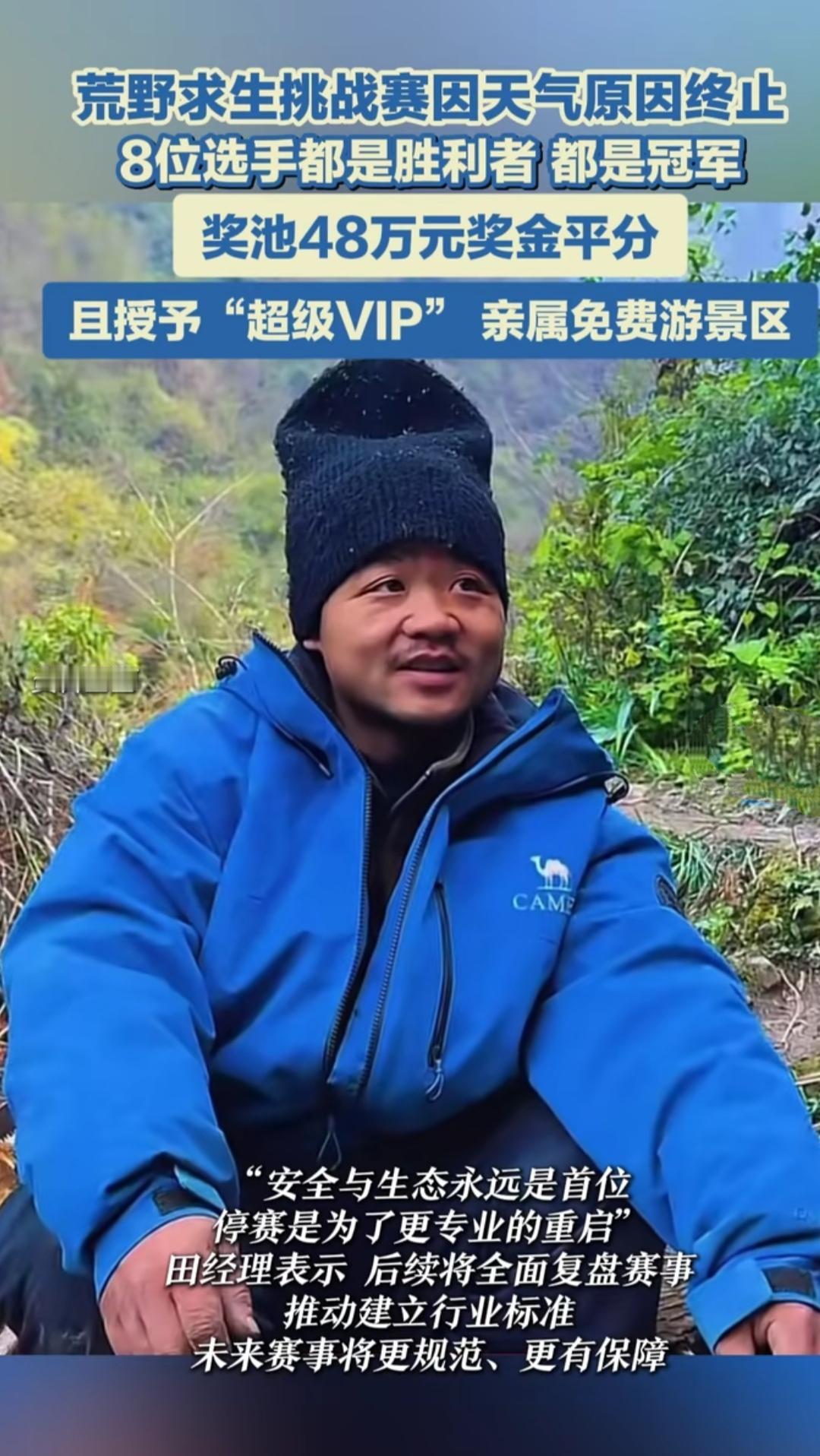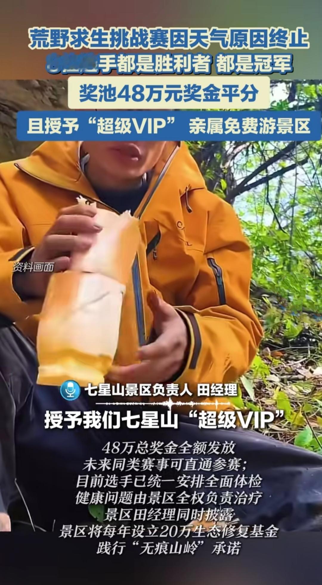 被张家界“宠哭”!见过比赛发奖金的,没见过停赛还加码送福利的!张家界七星山荒野求生赛,因-5℃寒潮+风雪紧急终止,8位选手没拼到最后,反倒收获比冠军还香的待遇! 主办方是真懂尊重——知道选手们在荒野熬过了体能极限,没让中途停赛变成遗憾,反而凑齐48万平分,追加“超级VIP”:本人+直系亲属终身免费游七星山,还能畅玩张家界300+景区,连未来赛事都能直通。 对比那些为流量硬撑、让选手冒生命风险的赛事,张家界这波操作堪称行业清流。它告诉我们:竞技从不是赢者通吃,而是无论结果如何,每一份坚持都该被善待。