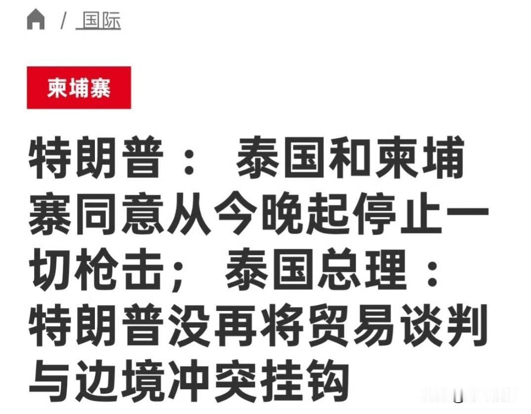 特朗普表示,泰国和柬埔寨已同意从今晚起“停止一切枪击”,并重返由美国斡旋的《吉隆坡和平协议》: 今天上午,我与泰国总理阿努廷·查恩维拉库尔和柬埔寨总理洪玛奈就两国长期战争不幸重燃一事进行了非常好的谈话。 他们已同意从今晚起停止一切枪击,并重返最初由我和他们共同签署的和平协议,该协议是在马来西亚总理安瓦尔·易卜拉欣的斡旋下达成的。