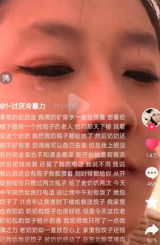 看哭了!近日吉林,女子将喝的矿泉水瓶一直攒着想给收废品的老人,那天下楼时正好碰见了收废品的老奶奶就把瓶子都给了她,没想过中午时接到老奶奶的电话,让女子中午不要做饭了,女子下楼后看到老奶奶手中的东西,直接泪目了。 吉林这位女子把平时喝剩下的水瓶子一直攒着,这天下楼时看到了在小区中捡废品的老奶奶就把瓶子都给了她,老奶奶接到瓶子后很不好意思,觉得女子可以自己卖掉,女子想着自己上班没有时间也不知道去哪里卖,就拒绝了老奶奶的好意。 老奶奶还想着帮女子卖完后把钱给女子,女子也拒绝了,女子看老奶奶这么热心,就决定以后把水瓶子都留给奶奶,就这么送了两次后,这天突然接到了老奶奶的电话,电话中奶奶让女子中午不要做饭后,让女子11点半准时下楼。 到了时间女子下楼一看,原来老奶奶给女子包了饺子,老奶奶担心饺子中午会被冻坏,特意用两个盆子给扣上了,女子到家后吃到这份盛满爱心的饺子直接泪目了。 女子说,家里也有奶奶,奶奶包的饺子很好吃,但是今天这位老奶奶包的饺子格外的香,自己不会是尽自己的微薄之力,却被老奶奶一直惦记在心里,家里包了饺子还特意给自己送一份。 有网友说:老奶奶占了一点带你便宜,就想把最好的给你,这份饺子可能她自己都舍不得吃。 也有网友说:奶奶一定是挑了一锅里最好看的送给你。 还有网友说:善良遇到了善良,看的我想家了,想念充满人情味的大东北。 女子在评论区中也说道,自己和奶奶的缘分不会结束,因为自己总会在小区中遇到奶奶,今天看到奶奶的手冻伤开裂,给奶奶买了护手霜送过去。 看了视频,为这份真诚的暖心而感动,看到老奶奶的穿着和手上的伤口,能看出老奶奶的家境并不算好,不然也不会大冬天依然出来捡废品,可奶奶在接到女子送来的瓶子时,第一反应不是高兴,而是想让女子自己去卖,在女子拒绝后,又想自己去帮女子卖再把钱给女子,生怕女子吃亏,这份原则的遵守就让人动容。 在收到女子两次瓶子后,老奶奶就想把最好的也给女子,特意给女子送来饺子,视频中的饺子个个皮薄馅大,可能老奶奶自己也舍不得吃,依然送给了好心的女子,这份藏在细节里的善良,真让人动容。 女子的回应也让人感动,从给老奶奶送水平的爱心,到吃饺子时眼中的泪水,再到为老奶奶买护手霜的回报,用自己的心意回应着老奶奶的善良,用自己的温暖在这个冬天为老奶奶排忧解难,这份双向奔赴的感动,在这个冬天格外的珍贵。 生活中最暖心的善良就是如此,你心疼我的不易,我回报你的善良,让善良永远在心中得到回应,这种简单的善良才最是难得,最能驱散生活中的寒冷。 你怎么看?评论区说说吧。