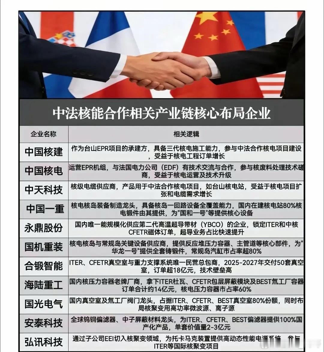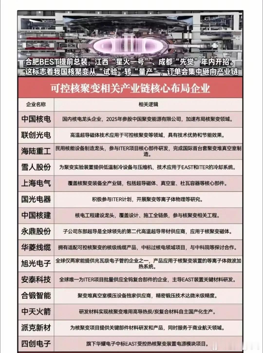 核电核能题材概念龙头梳理题材概念驱动事件:我国可控核聚变产业迎来关键突破!合肥BEST提前进入总装阶段,标志着我国核聚变正式从“试验”向“量产”迈进。题材概念投资逻辑:在全球“碳中和”背景下,它是唯一能同时满足规模性、稳定性与清洁性的能源选项。机构预测2030年全球核聚变市场规模接近5000亿美元。核电核能题材概念龙头代表有哪些?海陆重工:民用核能设备制造龙头中国核电:核电龙头参股中聚变安泰科技:全球唯一为ITER项目供应全钨复合部件的企业。中国核建:核电工程建设龙头。永鼎股份:子公司东部超导是全球领先的第二代高温超导带材供应商。