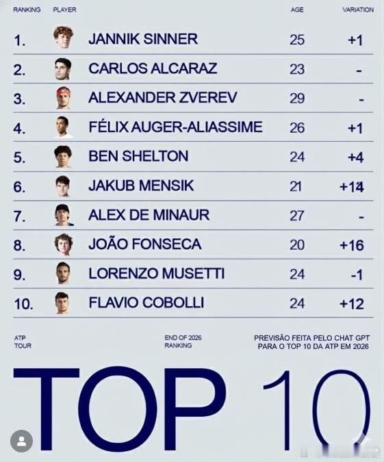 巴西媒体预测的2026年ATP年终前十,你们觉得靠谱吗?1、辛纳2、阿尔卡拉斯3、兹维列夫4、阿利亚西姆5、谢尔顿6、门希克7、德米纳尔8、丰塞卡9、穆塞蒂10、科博利网坛风云