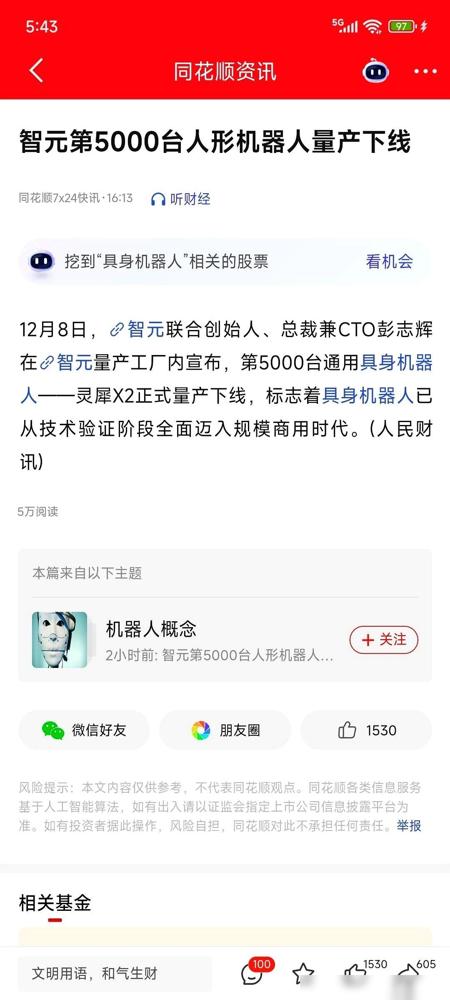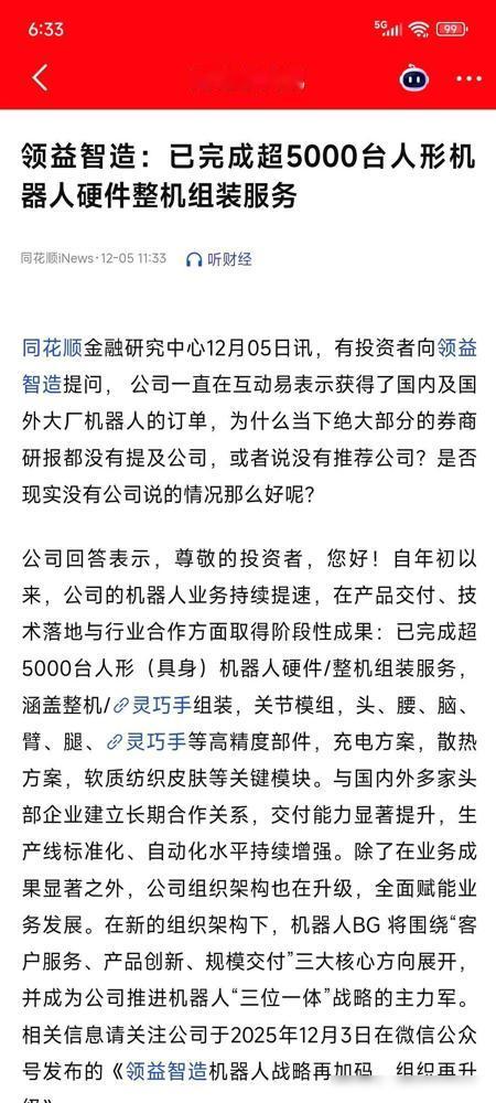 我跟你说,这事儿绝对不是巧合。 前脚领益智造悄悄发公告,说给客户组装了超5000台人形机器人;后脚“天才少年”稚晖君就在自家工厂宣布第5000台机器人量产下线。这俩动作跟约好了似的,明眼人都能看出——人形机器人早不是实验室里的模型了,是真能进工厂干活的“打工人”了。 咱老股民都懂,机器人板块最近41天跌得那叫一个惨,不少人套得账面绿油油,每天开账户都得深吸一口气。可现在风向真变了:国内量产线哗哗跑,老美那边又传政策松绑的风声,这架势像啥?就像困沙漠的人,眼瞅着前头有水源,天上还来了直升机。 说句实在的,从PPT到工厂堆货,说明产业链真跑通了。领益智造这种代工大厂都下场组装,稚晖君团队能稳定量产,技术和成本肯定过了坎儿。咱被套的兄弟也别慌,这波不是虚的,机器人落地的曙光,真要来了。 MCN双量进阶计划