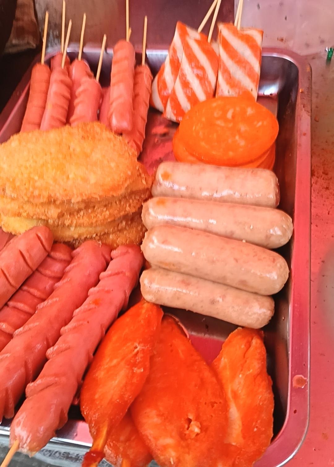 光是看着这满满一盘的食材,口水就先流下来了。红亮亮的烤肠蜷着纹路,裹着面包糠的鸡排蓬松得很,还有粉白相间的蟹棒、嫩乎乎的鸡肉串,每一串都码得整整齐齐,颜色鲜活得晃眼。 老板手脚麻利地把食材下锅,热油滋滋响的瞬间,香味就飘满了整条街。咬一口烤肠,外皮焦脆内里爆汁,鸡排更是外酥里嫩,蘸上酱料一口下去,满嘴都是夜市的烟火气。 果然啊,平凡日子里的快乐,永远是这些街头小吃给的,谁能拒绝这样一份热乎的炸串呢?