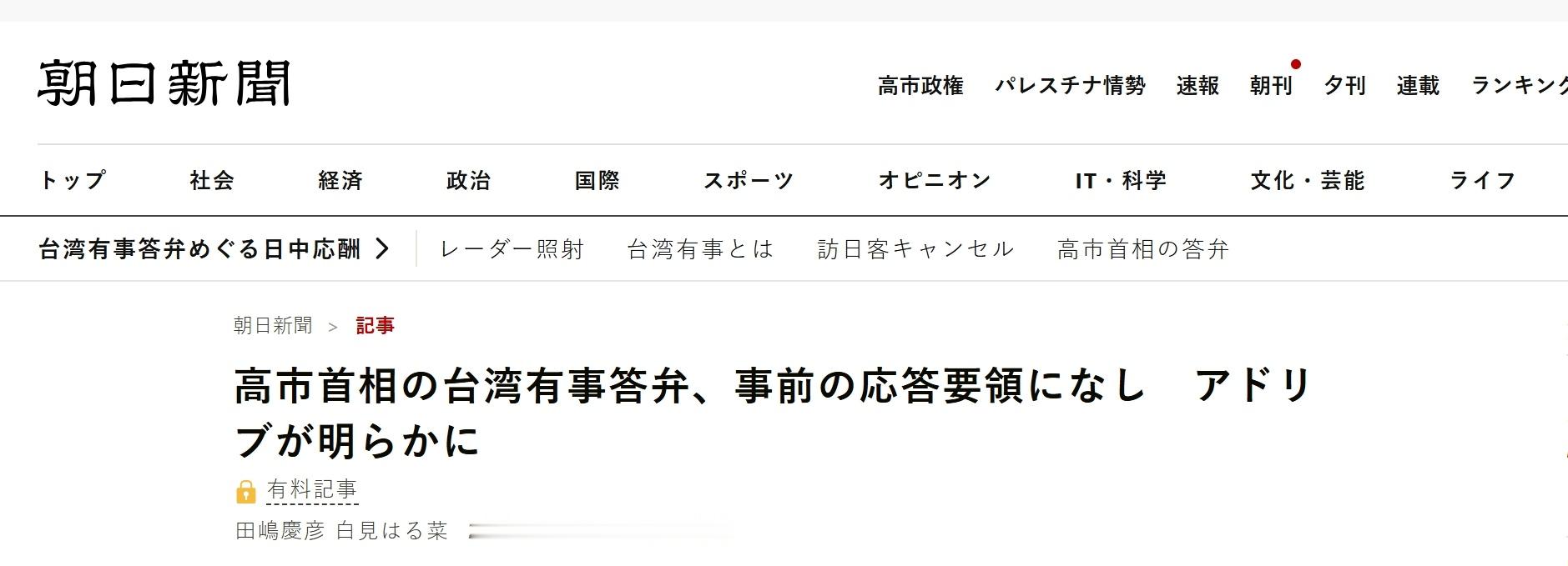 朝日新闻:高市早苗的挑衅言论不符合预先制定的应对准则,显然是即兴发挥的。➤下一步准备怎么说,日本的首相代表不了日本政府?日方应老老实实撤回错误言论烽火问鼎计划热点观点