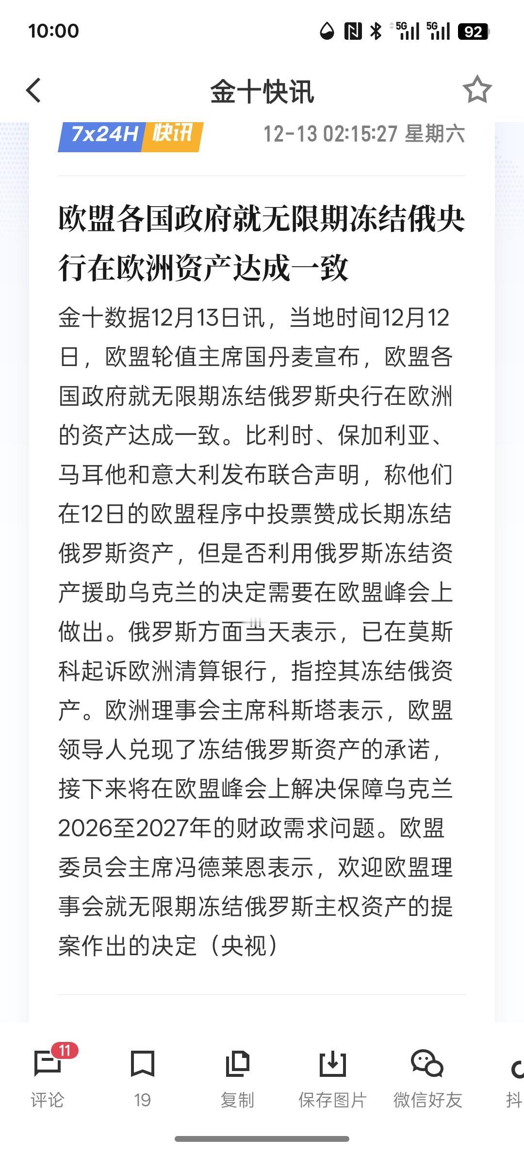 欧盟各国政府就无限期冻结俄央行在欧洲资产达成一致,这下好了,如果真的要冻结俄罗斯的海外资产,甚至把这些资产拿来去支持乌克兰,那势必会引发俄罗斯与欧洲的冲突!欧洲的自身安全防御肯定会受到来自俄罗斯的压力!而美国未来肯定会逐渐的选择脱身欧洲的事情!欧洲与俄罗斯发生对抗,欧洲会加速衰退!欧洲冻结俄罗斯的资产,如果真的达成一致,用于支持乌克兰,这是一个不明智的选择,会把欧洲拖入战争!
