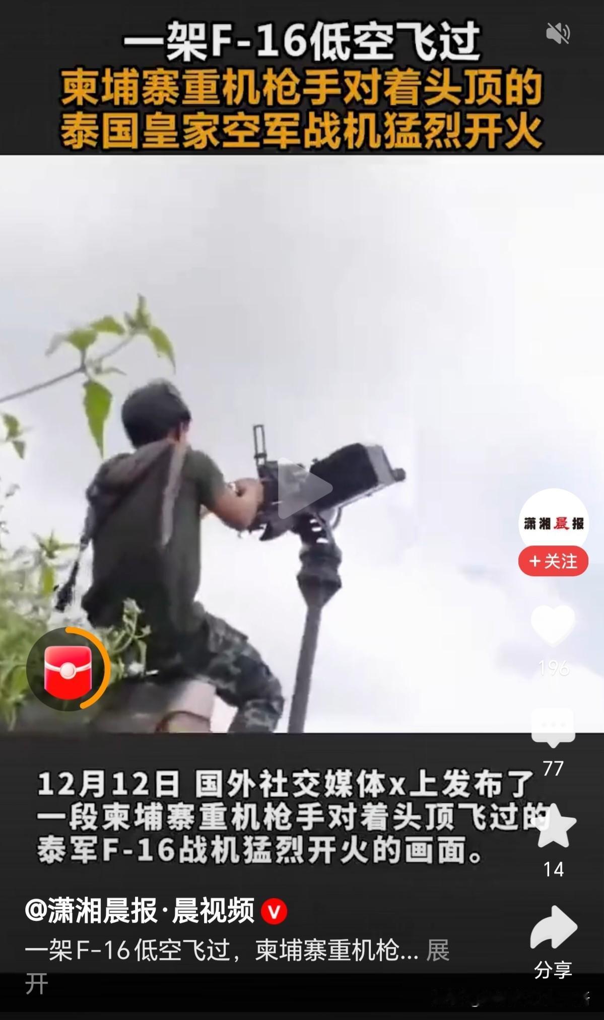 泰国皇家空军的F—16低空飞行,遭柬埔寨重枪机手猛烈开火! 牛! 在这种你死我活的时候,就佩服这样的狠人,先别管打得到打不到!也别管打得赢打不赢!先打了再说!