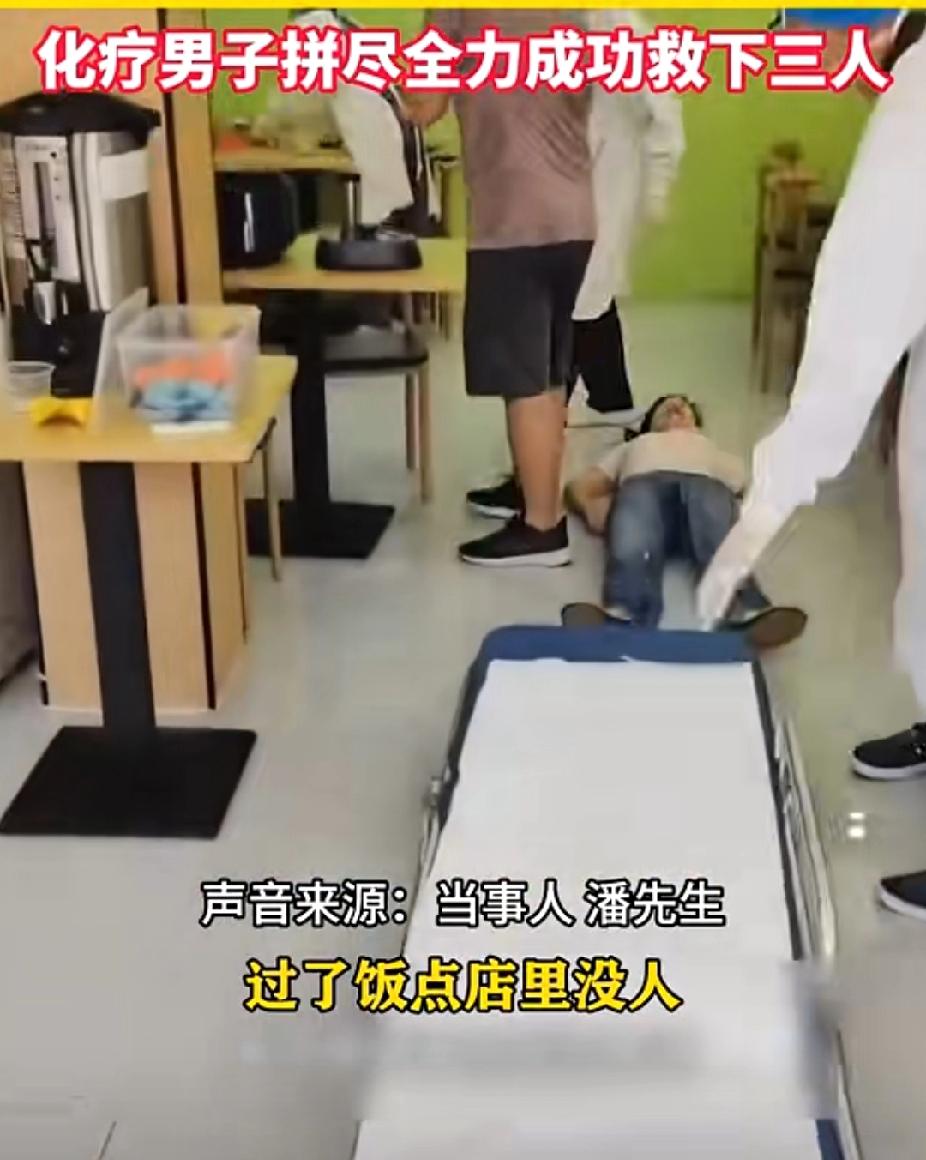 12月12日,广东佛山男子化疗完去吃饭,撞见店内三人一氧化碳中毒倒地,不顾身体虚弱拼尽全力救下三人! 12月12日,广东佛山的潘先生最近身体不适睡得很晚,当天化疗完后已经下午两三点,已经过了饭点。潘先生去到一家饭馆准备吃点东西,推开店门看到的一幕令潘先生心里“咯噔”一下! 只见厨师大哥和老板娘双双倒在用餐区的地上,潘先生意识到大事不妙,冲进厨房后发现帮厨的阿姨也晕倒在厨房里面。 潘先生看到厨房有三个煤气罐,他挨个检查,发现最里面那个煤气罐没有关,潘先生赶紧关上了煤气罐。 因为潘先生刚刚化疗完,身体非常虚弱,但他还是拼尽全力将三人拖到了安全通风的地方,然后拨打了急救电话。目前,三人都已经脱离了生命危险! 看到这里,我的心里很难过。这么好的人,怎么会生病呢?这么好的人,上天一定要保佑他,赶紧好起来! 救人一命,胜造七级浮屠。让我们一起为潘先生祈福,祈愿他早日康复,余生平安健康! 善良