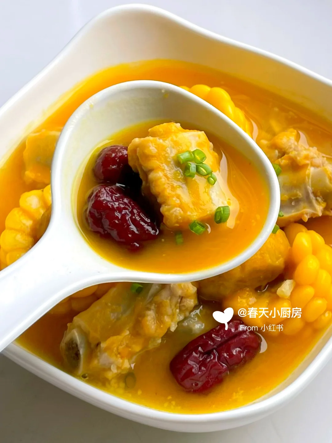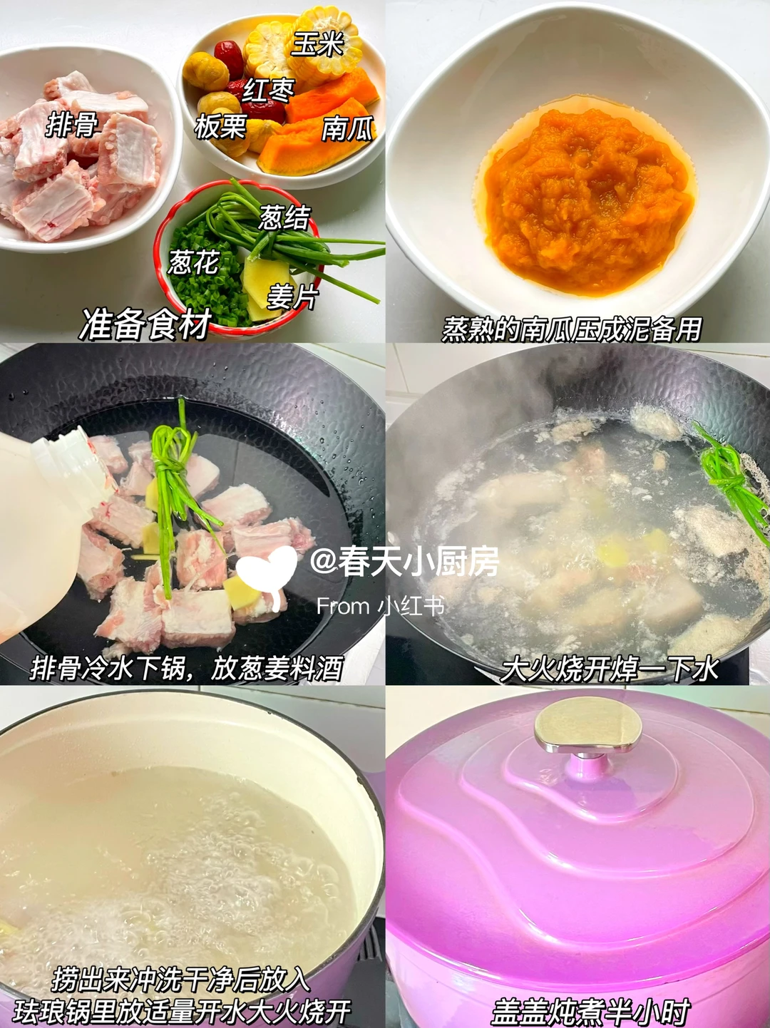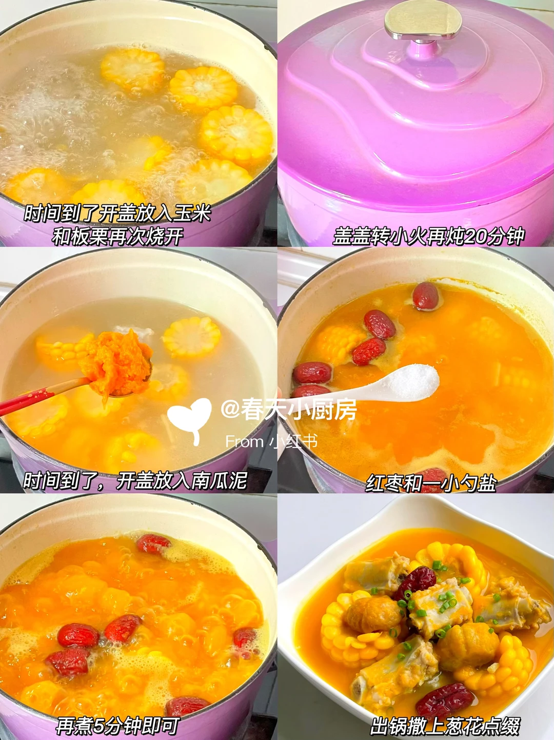 做菜我是认真的 🌈🌈 入冬后,天气一天天变冷了,最治愈的莫过于一碗热气腾腾的浓汤。今天就给大家带来一道颜值与口感并存的秋冬必喝的暖汤——金汤板栗排骨。金黄浓郁的汤汁裹着软烂脱骨的排骨,搭配粉糯的板栗、清甜的玉米和温润的红枣,每一口都集齐了鲜、香、甜、糯,喝完整个人都暖烘烘的,不管是犒劳自己还是招待家人都超合适! 🌿🌿食材 排骨,板栗,南瓜,玉米,红枣,葱姜 🔍🔍做法见图三图四哈