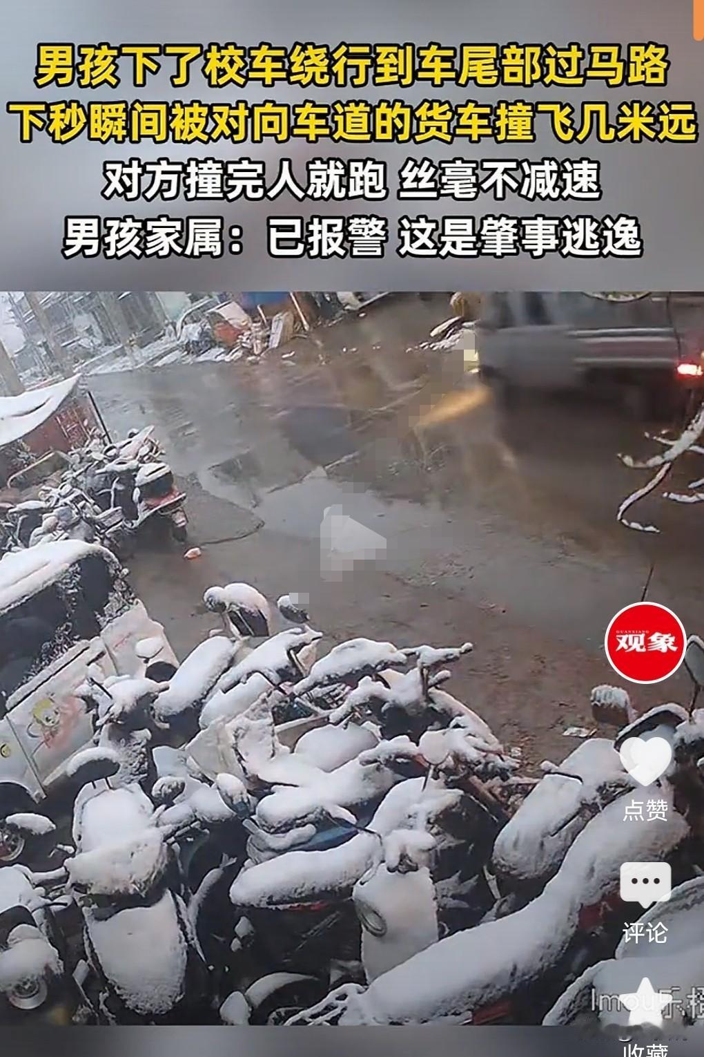 12月13日江苏徐州。 男孩下了校车绕行到车尾部过马路。 没想到被一辆货车撞飞了。 最可气的是货车撞人后没有选择停下,而是不想负责任,肇事逃逸了。 男孩的家属选择了报警。 一定要将这个肇事司机找到。 让他付出应有的代价。 本来情节没这么严重,但是司机跑路了,这个问题性质就大了。