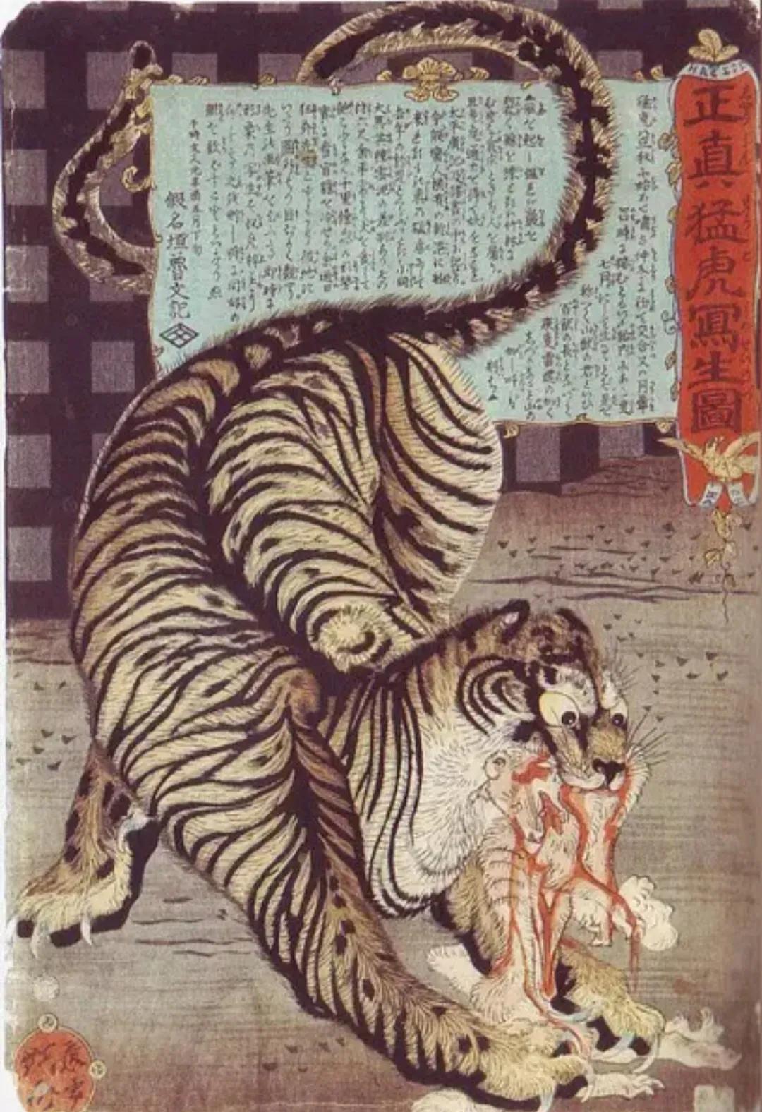 日本本土没有老虎,古代的日本人只听说过老虎,却没有见过,直到平安时代,新罗才向日本天皇进献了两头老虎,天皇视为珍奇异兽,只在宫廷里让皇室和贵族参观,所以那时的普通日本人仍没见过老虎。 丰臣秀吉侵略朝鲜时,大将加藤清正把三头老虎弄到了日本公开展示,日本人第一次亲眼目睹老虎,人们趋之若鹜,加藤清正也得了个外号“虎清正”。 日本商人看到了商机,就从中国和朝鲜弄来老虎展览收钱,一次收十几个铜板,生意火爆。但是捕捉运送老虎需要足够的财力支持 ,一般商人根本没这个实力,于是他们就弄一张虎皮展览,这样的生意依然很火,一些商人就靠展览老虎和虎皮发了财。