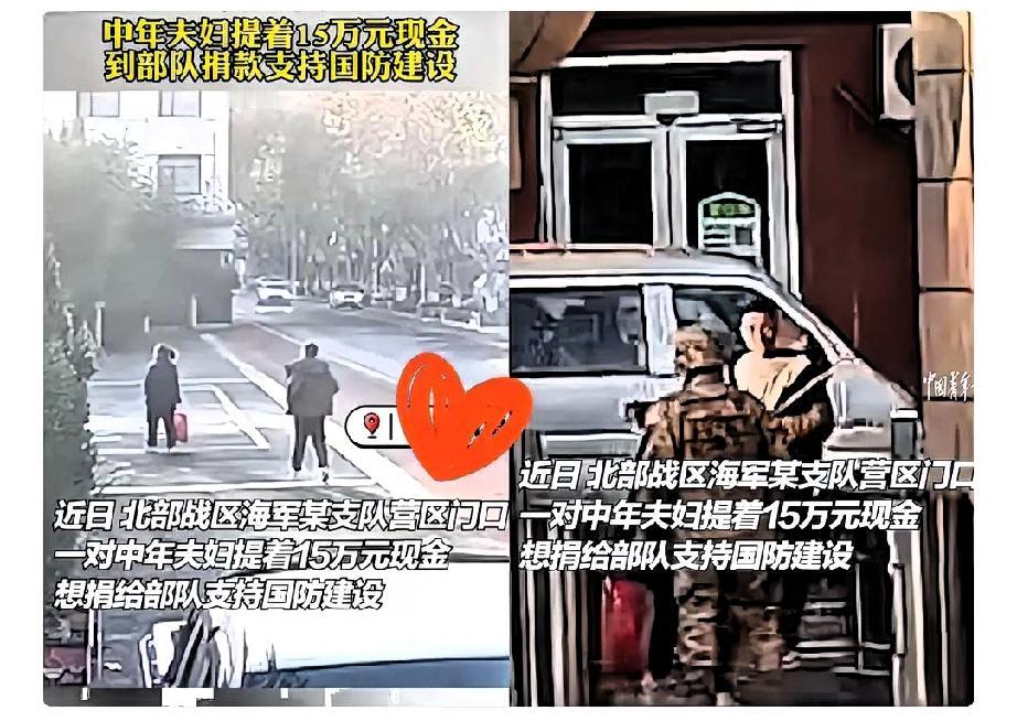 格局太大了!山东威海,夫妻俩拿着个手提袋送到了北部战区海军支队营区门口,士兵还以为他俩要寻求帮助呢,万万没想竟然是捐给部队15万元现金用于支持国防建设!士兵连忙拒绝,但是俩人放下手提兜直接就走了,离开时俩口子大步向前,走出了一身的骄傲! 山东威海一对夫妻来到北部战区海军支队,拿出15万元现金,直言不讳:“我们就想支持你们国防建设,让你们放心打仗。” 士兵们以为他们是来寻求帮助的,没想到他们是专程来捐赠的,士兵们被感动得热泪盈眶。 这就是威海人深厚的拥军情怀,这就是威海人骨子里流淌着的拥军基因。 威海地区五代“拥军船”航程超过20万公里;威海人民用双手为军队制作鞋垫、毛袜、毛裤、毛被等生活用品;组织各类志愿服务活动;建立社区服务站、便民服务点,为驻军提供服务…… 形成了独特的“5+1”双拥模组化部署,推动军民合作从点到面再到体,实现飞跃。 威海企业借助科技创新为部队发展提供支持,现代拥军有了多样化的形式,不再是简单的捐资助学。 民间捐赠不仅仅是金钱支持,更是对国防建设集体投资,体现出威海人民对国防的责任感与自觉。 麻烦看官老爷们右上角点击一下“关注”,既方便您进行讨论和分享,又能给您带来不一样的参与感,感谢您的支持!