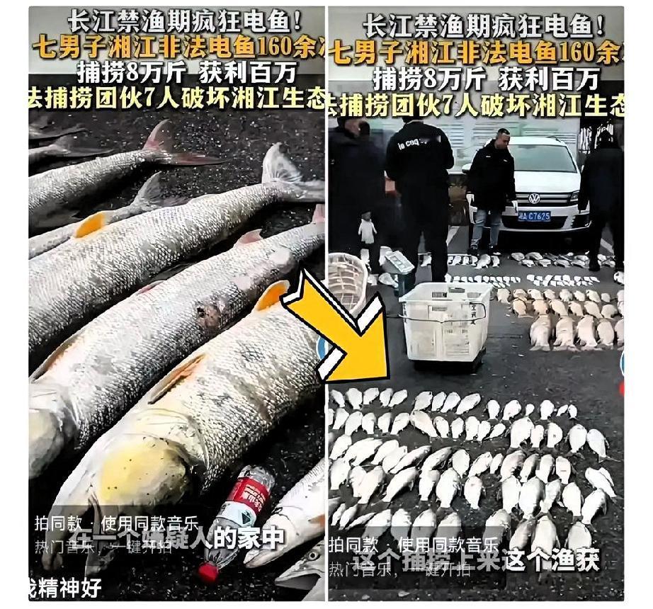 七个人夜里开着改装小船,把高压电杆伸进湘江,一通电下去鱼成片翻肚,两年捞了八万斤,卖了上百万。 七人深夜在湘江上用改装小船和高压电杆电鱼,二年时间捕捞八万斤,非法获利超过百万元,破坏水域生态。 今年2月,湖南省渔政部门接到群众举报,称有不法分子在湘江上用电鱼的方式捕捞鱼,数量巨大,破坏水域生态。 该部门通过无人机巡查和夜间巡查相结合的方式,成功抓获七名不法分子。 七人使用改装小船和高压电杆电鱼,在湘江特定水域电鱼,两年时间捕捞八万斤,非法获利百万元以上。 湖南省渔政部门赶到现场时,七人刚刚收网,捕捞到一大筐鱼,现场扣押作案工具小船两只和捕捞到的鱼一大筐。 该七人涉嫌破坏水域生态,将面临法律制裁,同时也要赔偿生态修复费用。 禁渔不是口号,破坏生态必付代价! 麻烦看官老爷们右上角点击一下“关注”,既方便您进行讨论和分享,又能给您带来不一样的参与感,感谢您的支持!